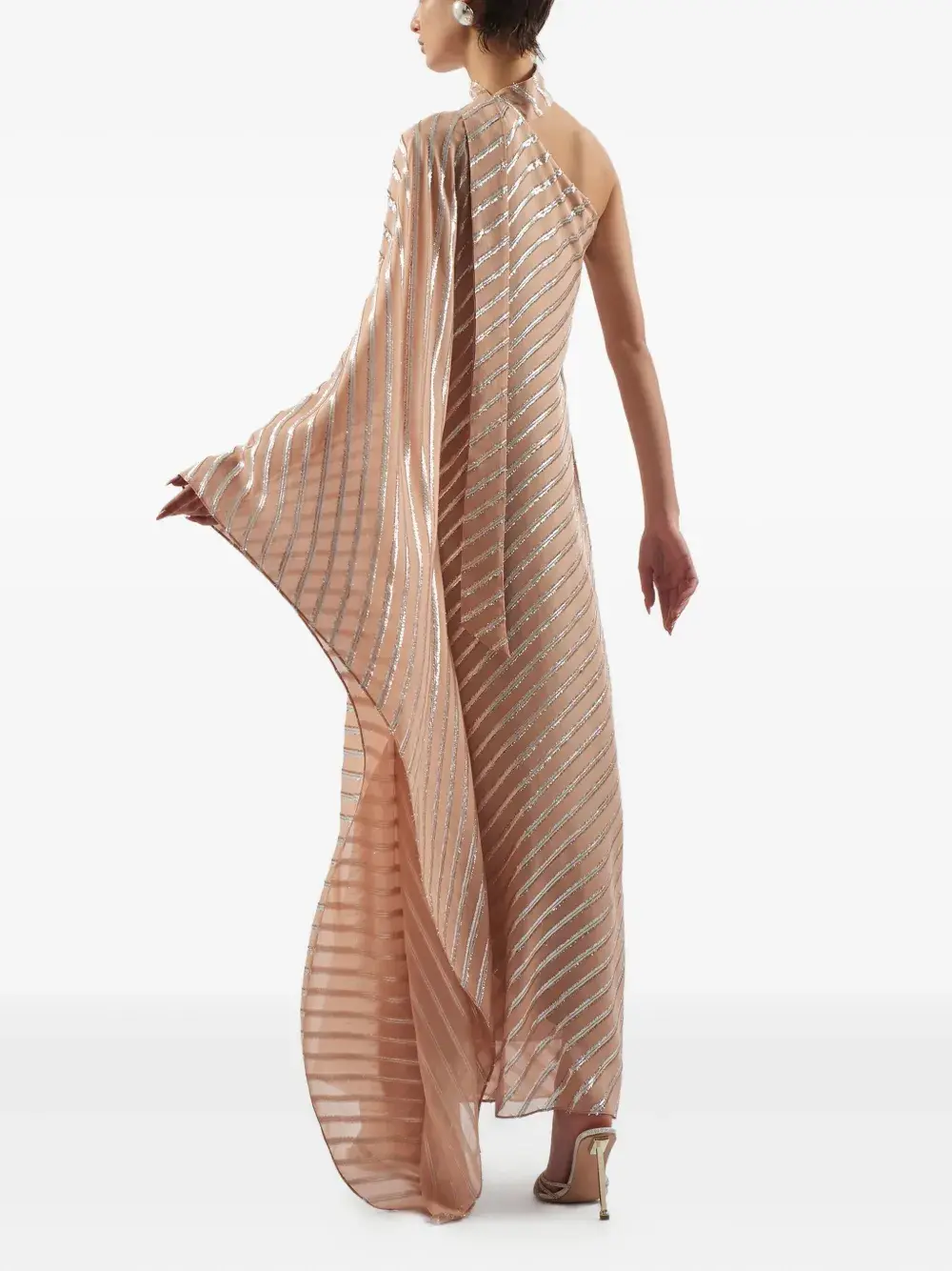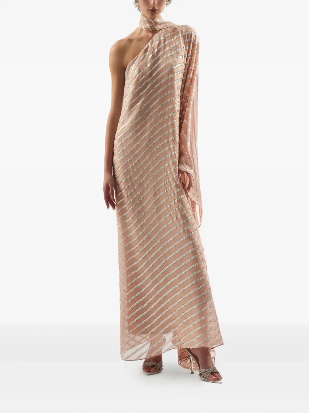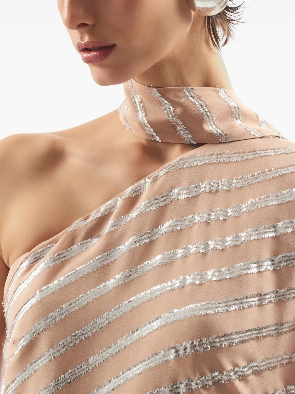 Бледно-розовые, серебристые, с пайетками, полосками, вырез на одно плечо, асимметричный подол, высокий ворот, широкий рукав