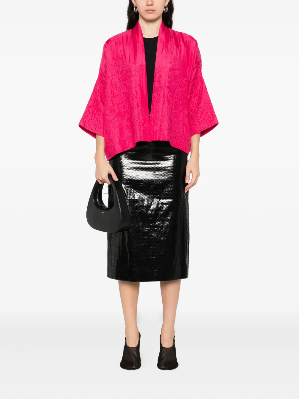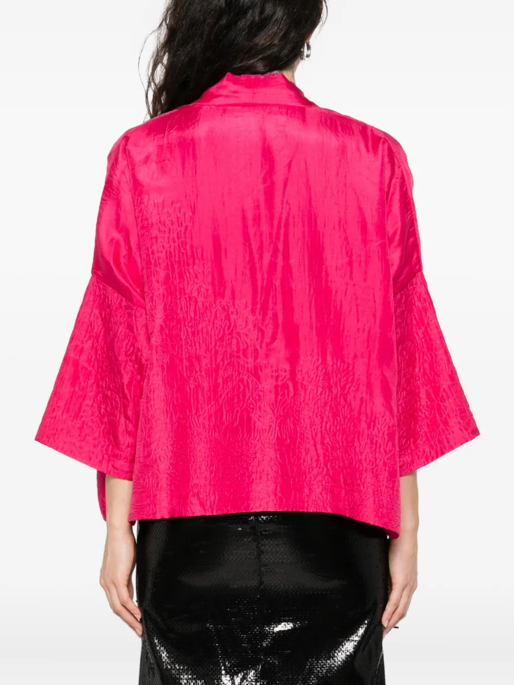 Розовый, с короткими рукавами, открытым спереди, укороченный, текстурированный шелк