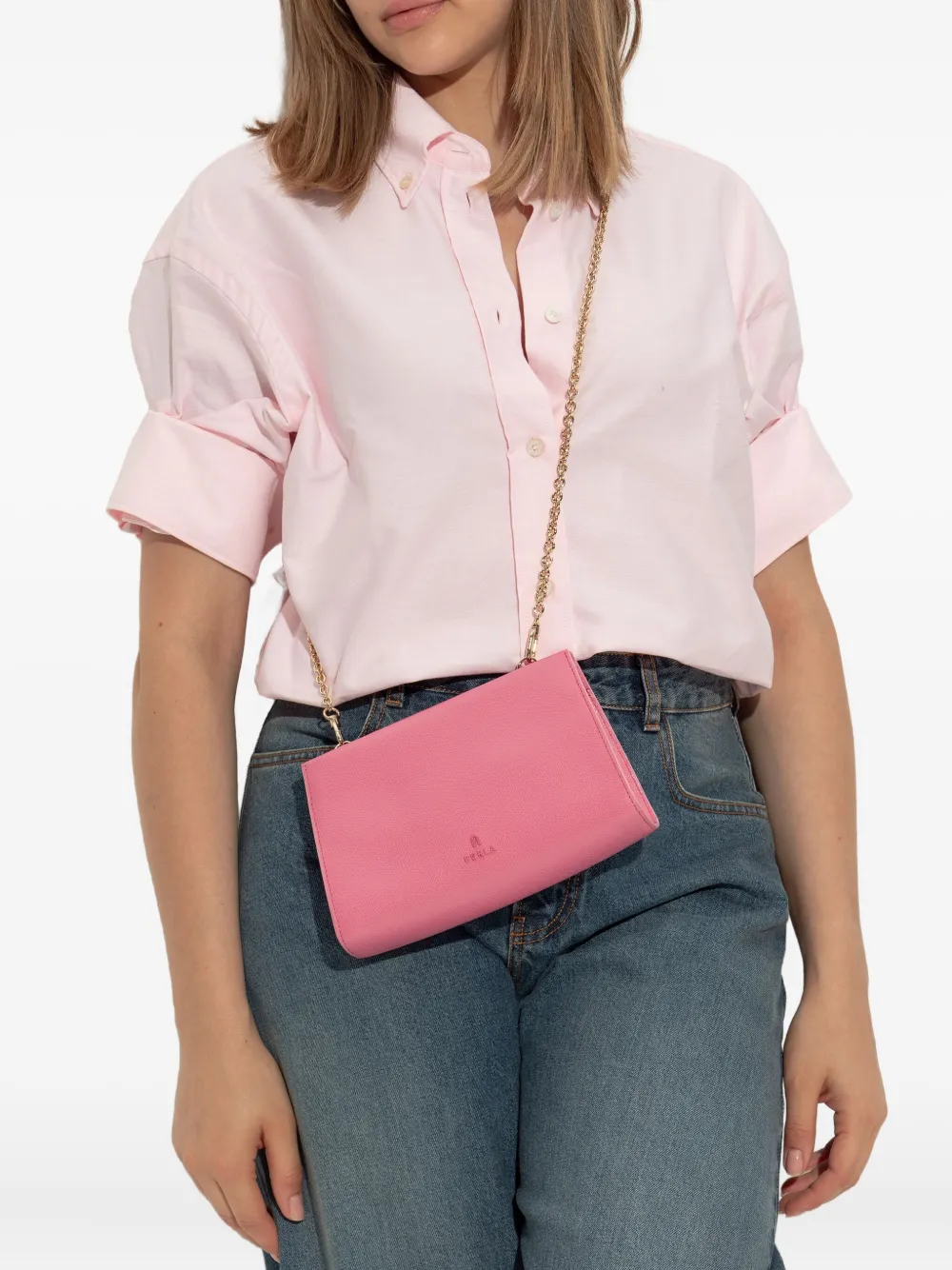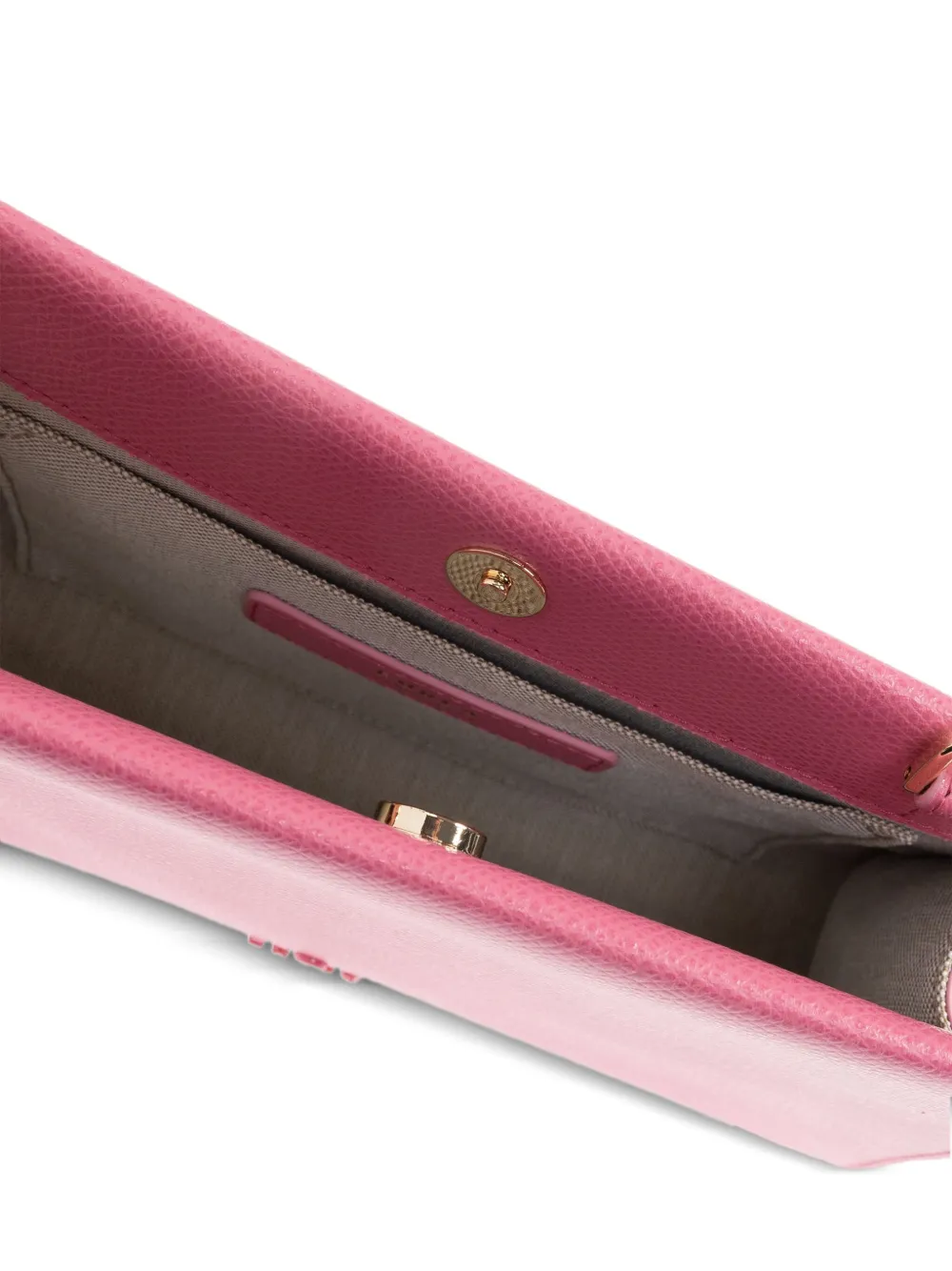Розовая кожаная конструкция, золотистый ремешок-цепочка, магнитная застежка, логотип