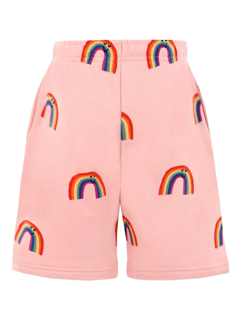 Розовый радужный узор, мотив улыбающейся радуги, мотив облаков, эластичный пояс, боковые карманы