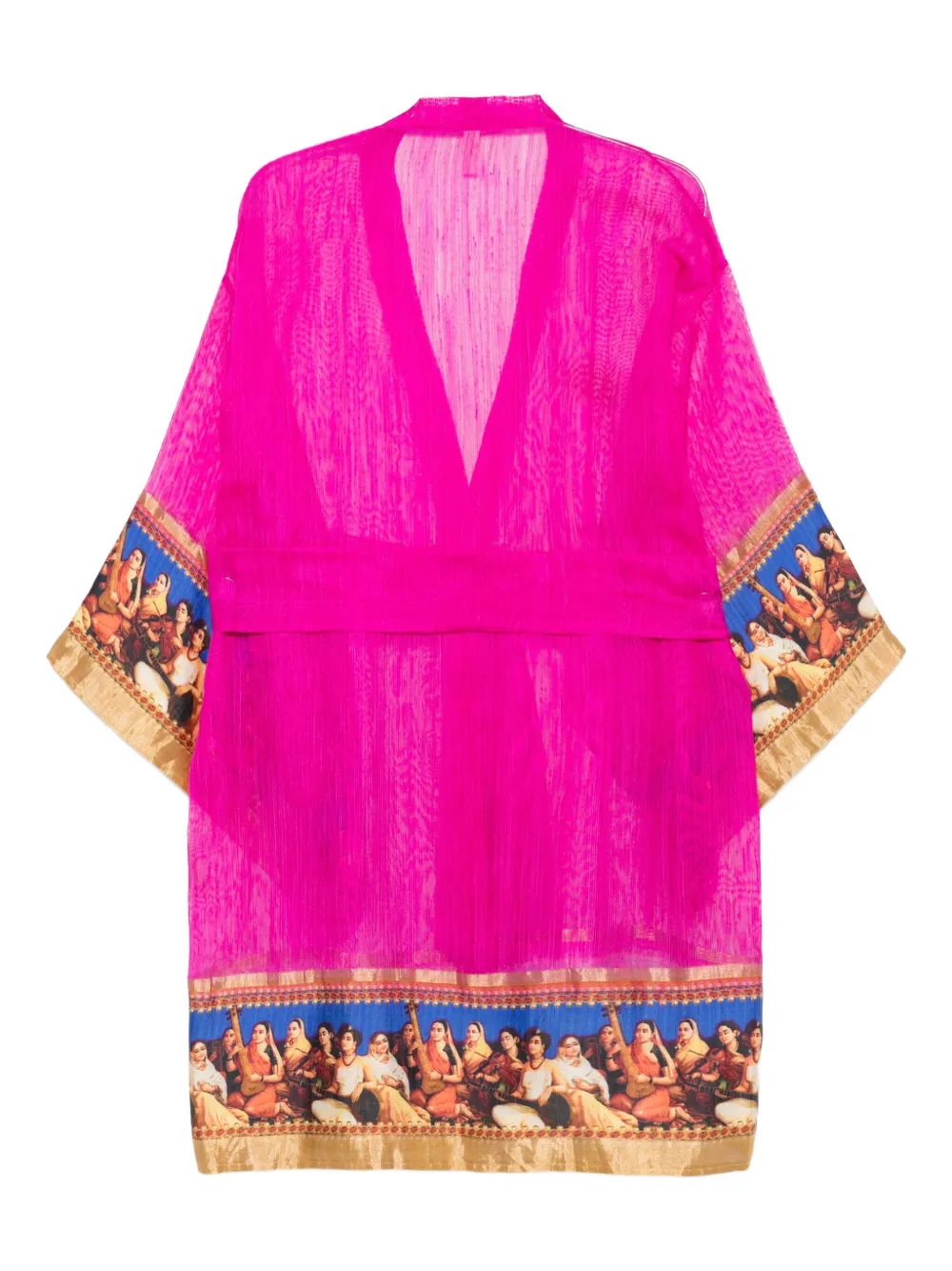 Принт цвета фуксии с индийской тематикой, завязывающийся пояс, рукава три четверти, V-образный вырез, золотая отделка