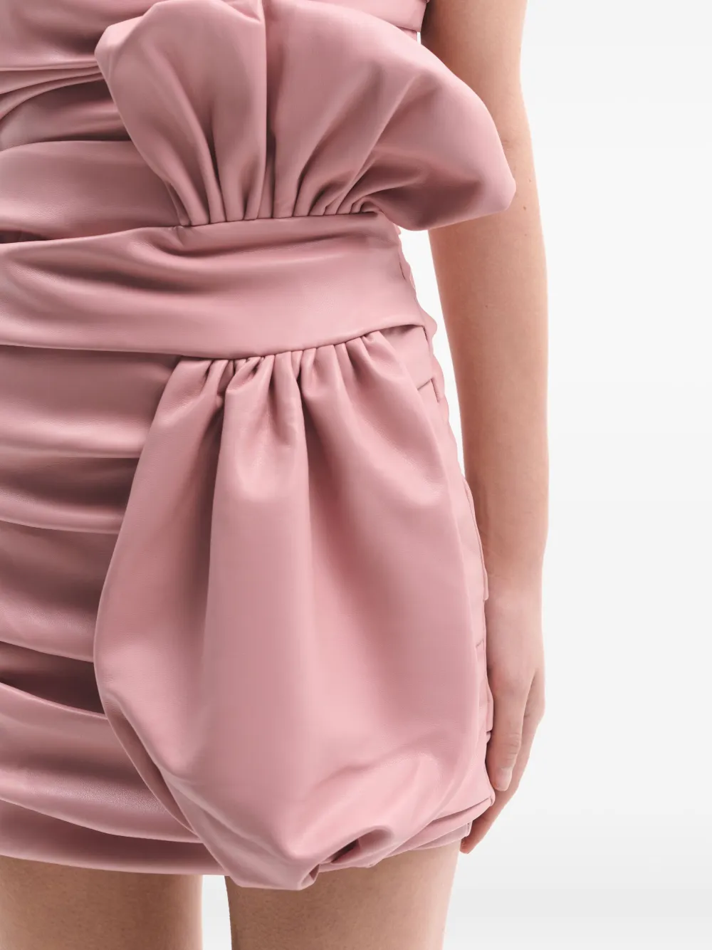 Розовая драпированная ткань, бант, присборенная талия, мини-длина, асимметричный подол