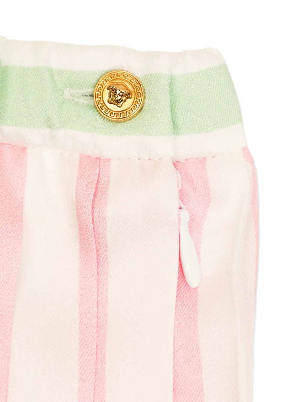 Светло-розовая застежка на пуговицы и молнию сбоку, вертикальный полосатый принт, эластичный пояс