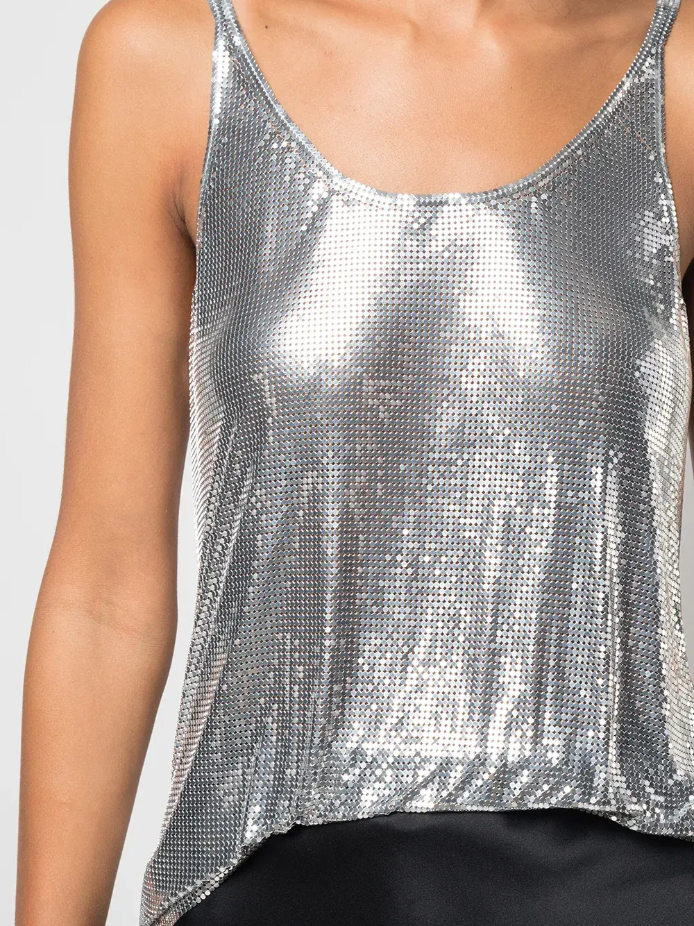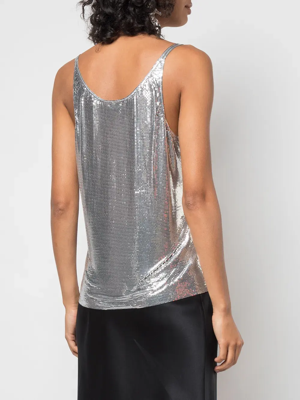 Сетчатый топ с эффектом металлик от Paco Rabanne. Круглый вырез, модель без рукавов, прямой подол и металлический отблеск.
