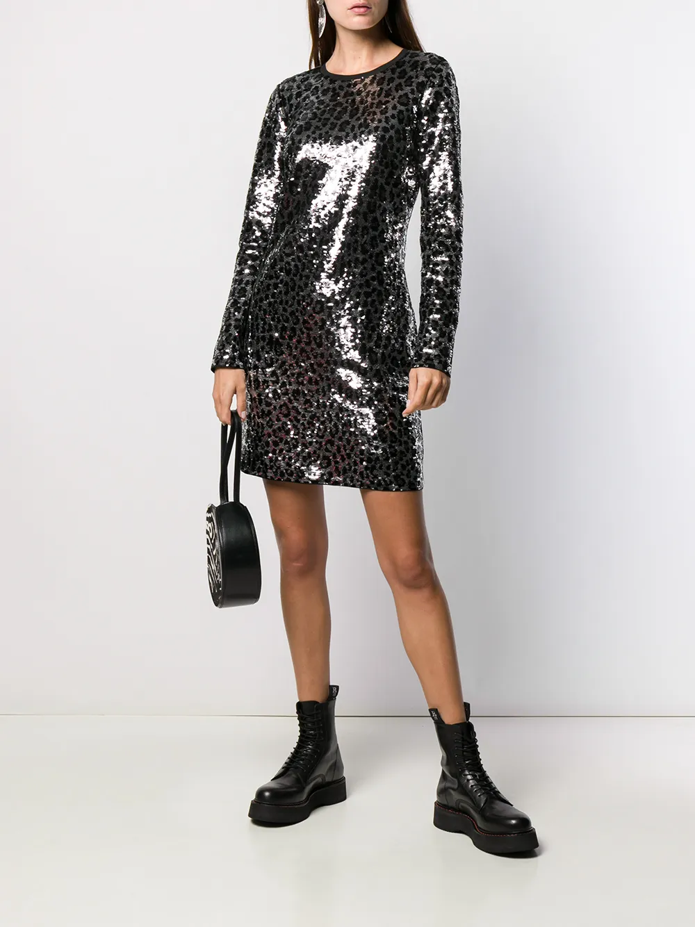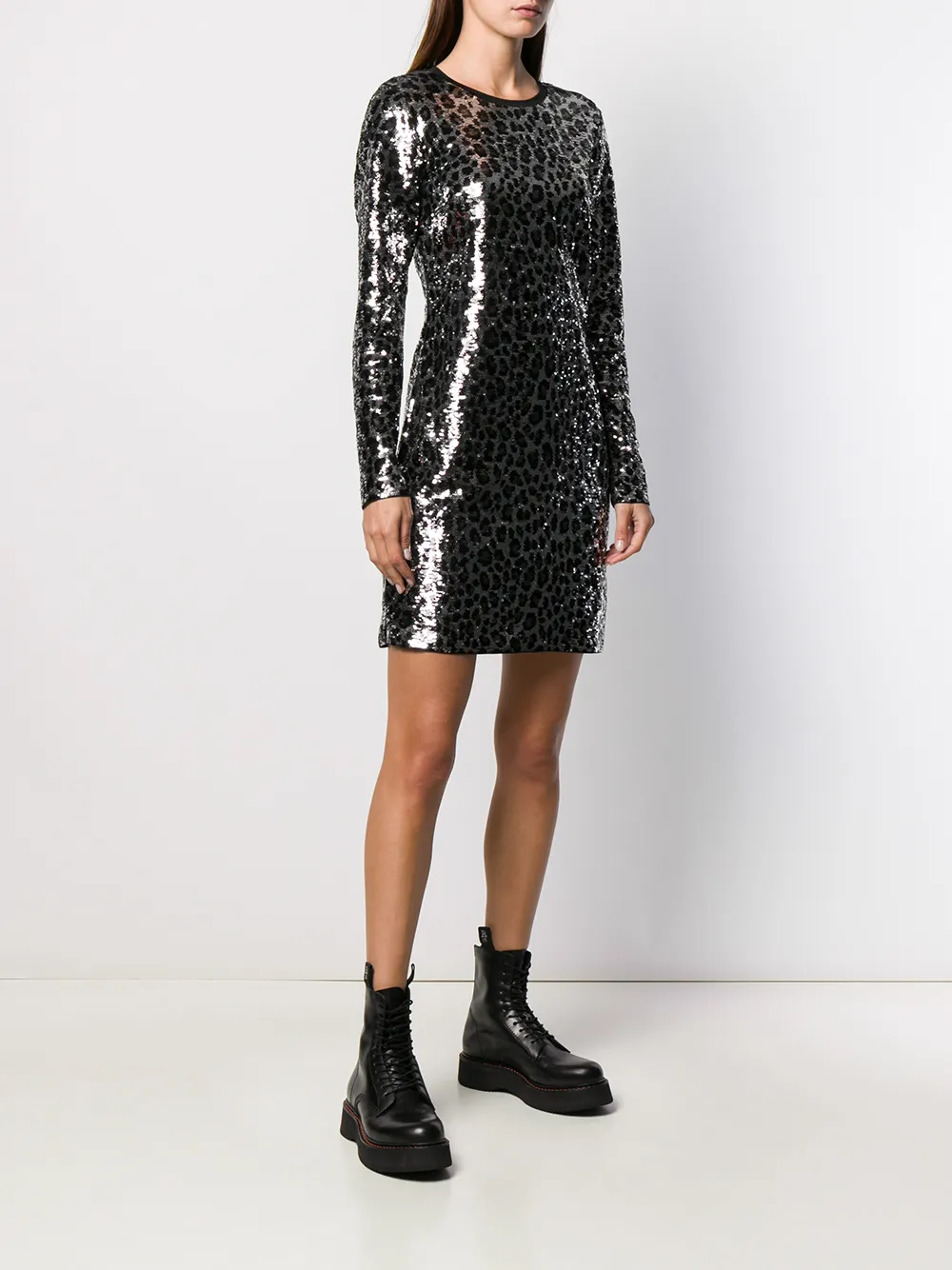 Платье с вышивкой пайетками от Michael Michael Kors (Майкл Майкл Корс). Круглый вырез, длинные рукава, приталенный силуэт, короткая длина, прямой подол и задняя невидимая застежка на молнию.