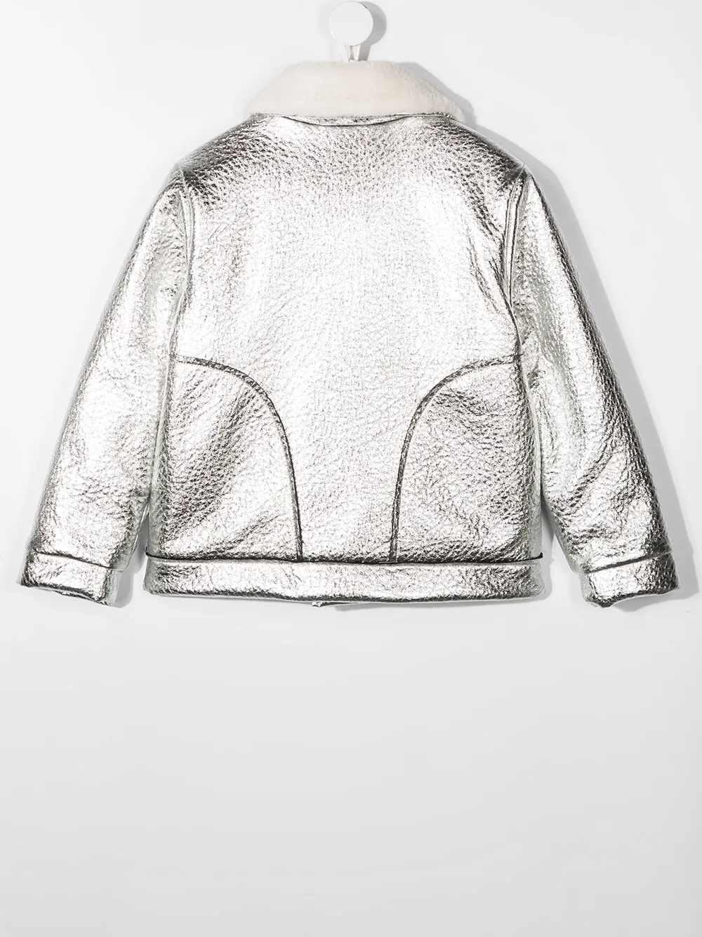 Отделка из искусственной овчины, эффект металлик, смещенная застежка спереди и длинные рукава. Цвет: серебристый.