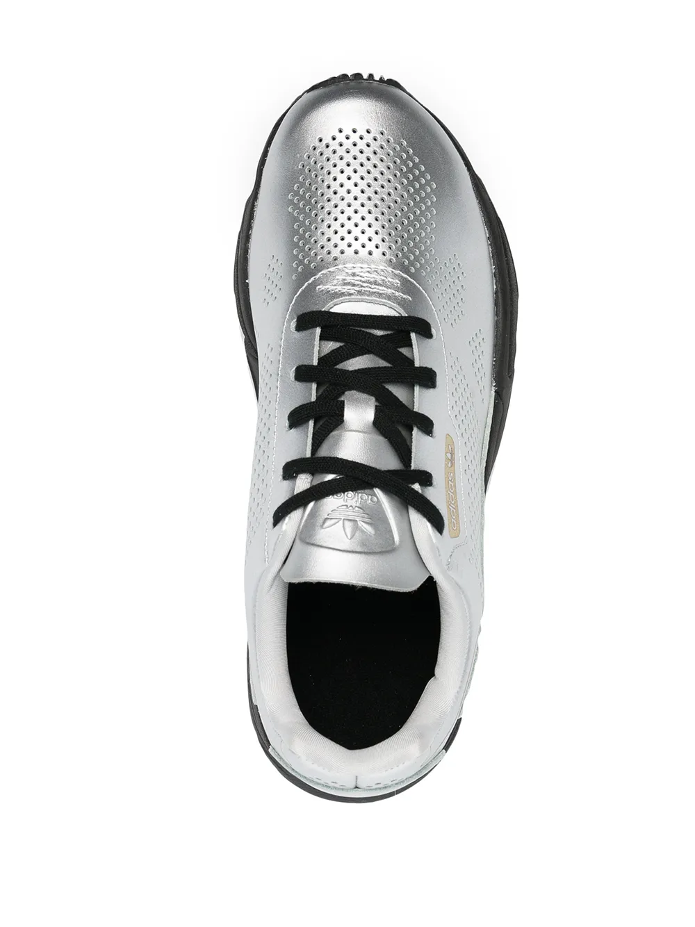 Покрытие с эффектом металлик, перфорация, закругленный носок, уплотненная щиколотка, шнуровка спереди и шнуровка сзади. Цвет: серебристый.