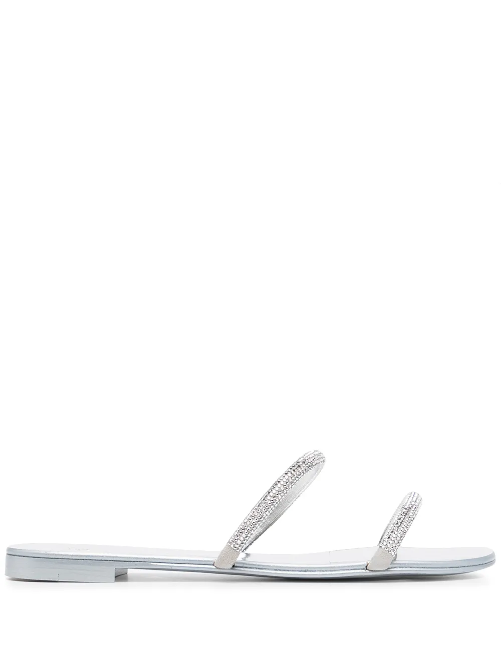 Декор из кристаллов, ремешки, открытый носок, стелька с логотипом и плоская кожаная подошва.