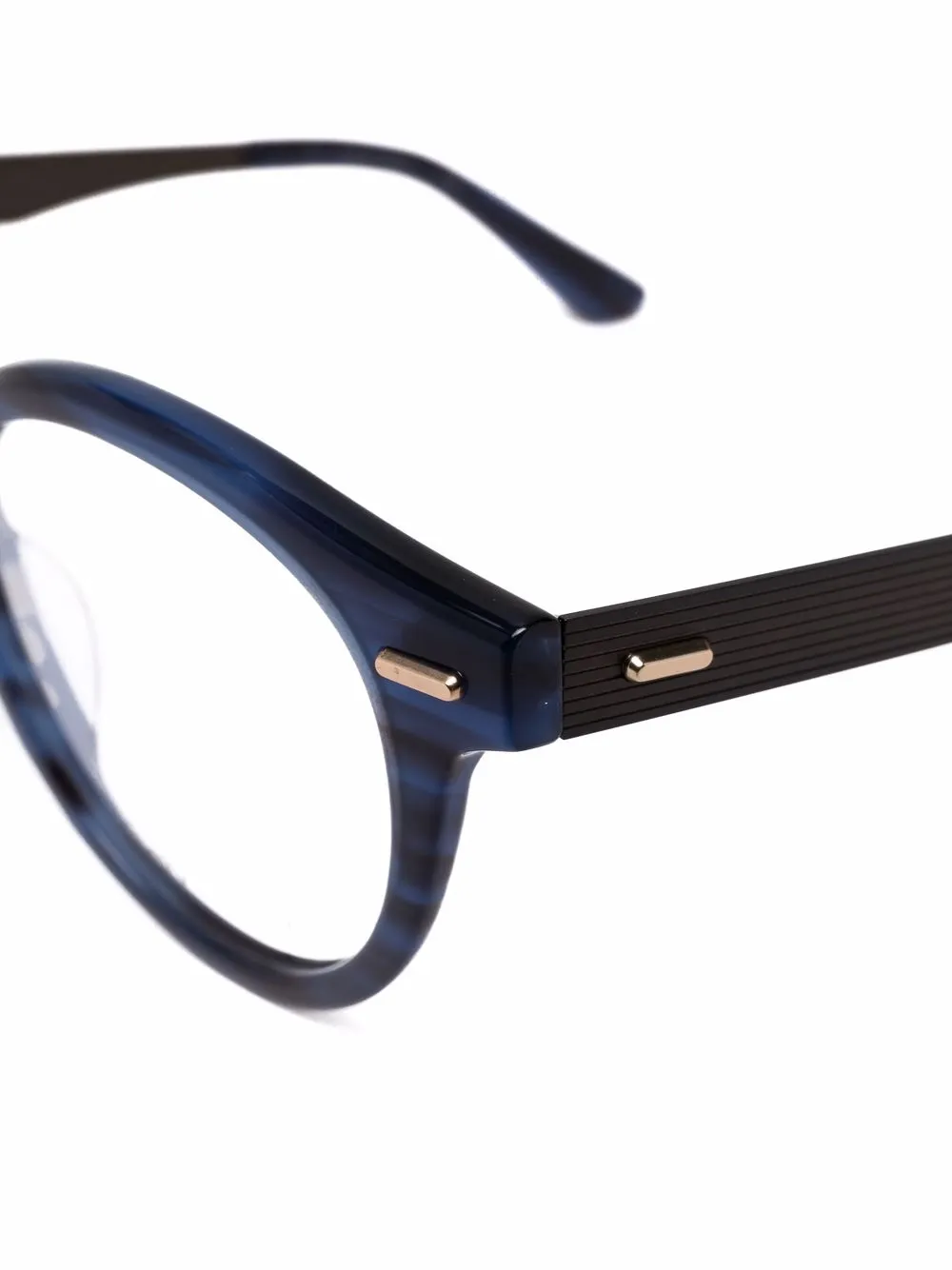 Круглая оправа, прозрачные линзы, прямые дужки, золотистый логотип и дужки с закругленными концами. Цвет: синий. Обратите внимание, что на FARFETCH продаются оправы с линзами без диоптрий. В комплект входит защитный чехол для очков.