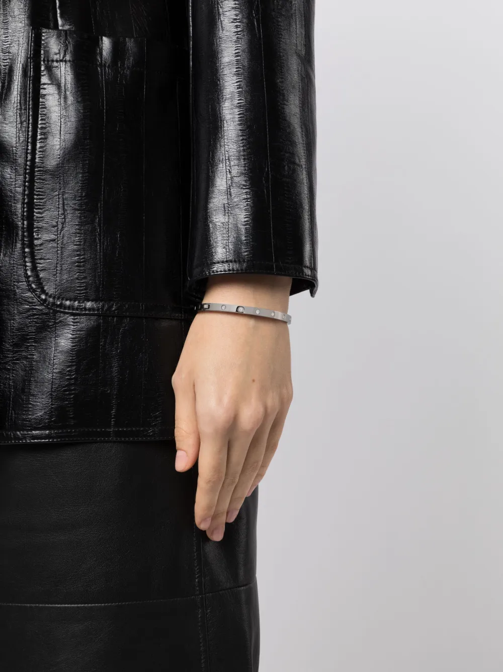 Серебристый, металл, декор из стеклянных кристаллов, выгравированный логотип и застежка на зажиме.