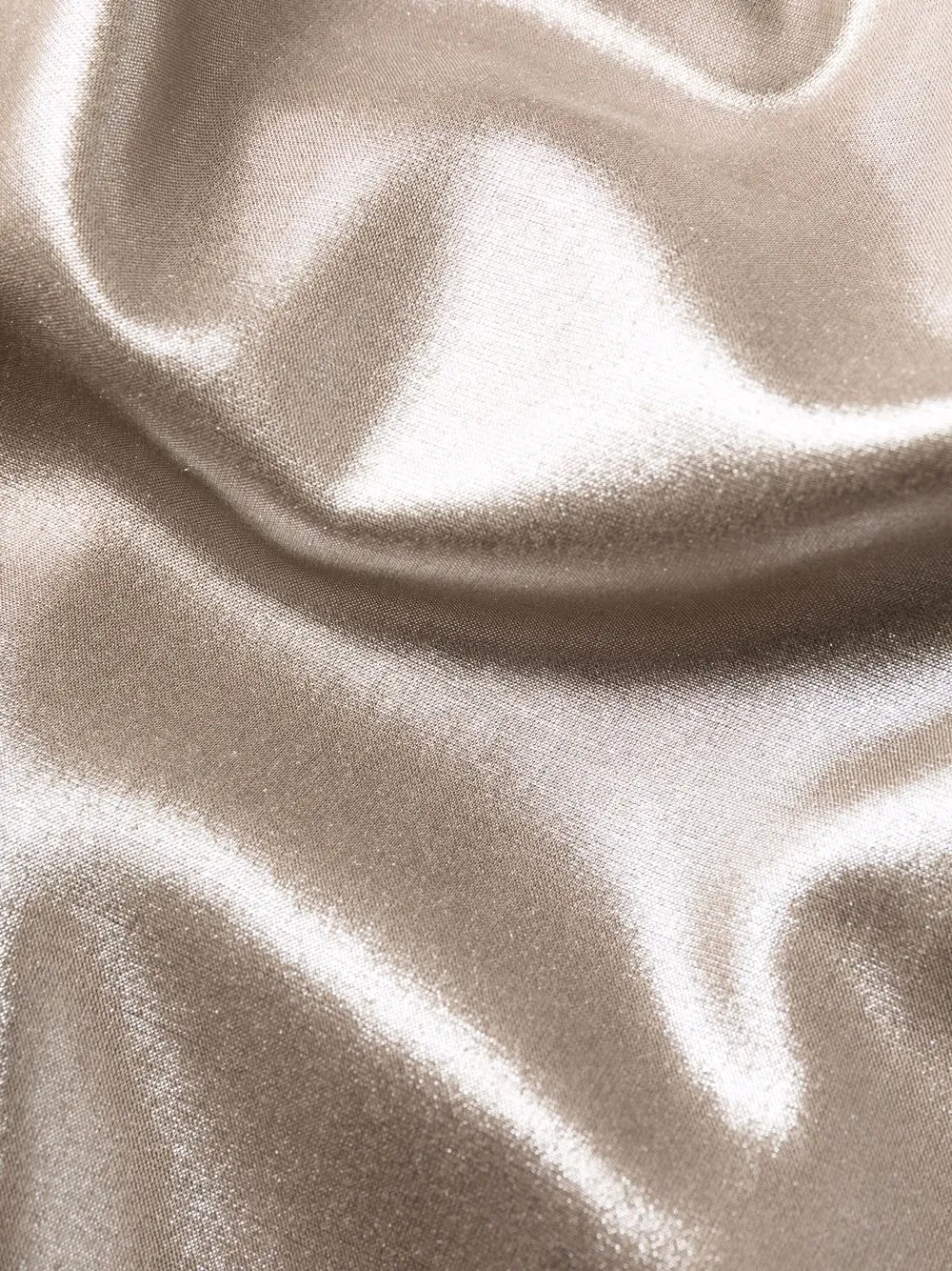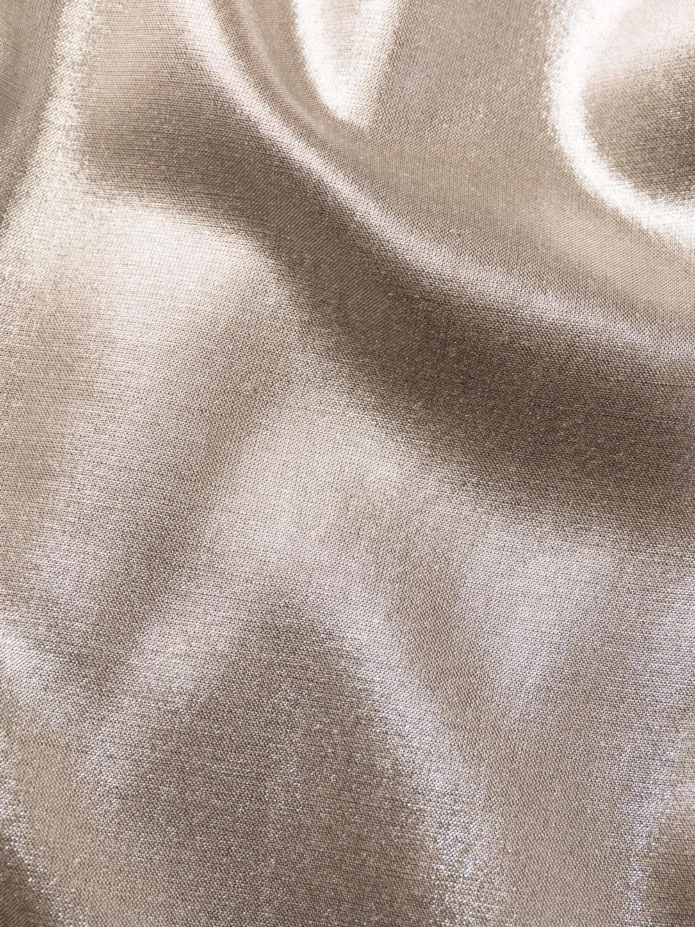 Эффект металлик, V-образный вырез, без рукавов и драпированная юбка.