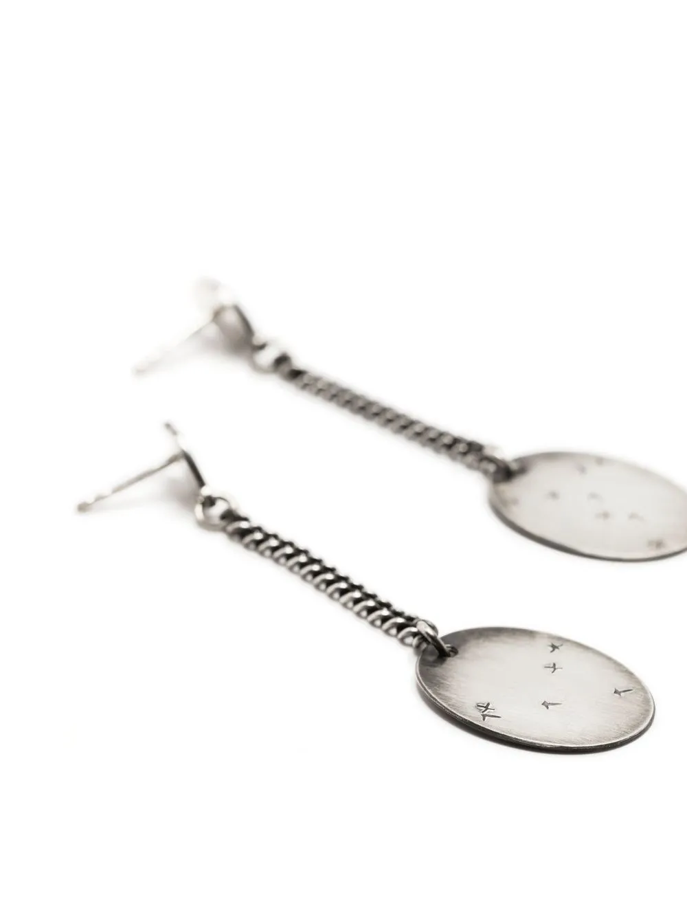 Серебристый, серебро 925 пробы, серьги-подвески, круглая подвеска, гравировка, цепочка, фурнитура с состаренным эффектом, застежка-штифт и для проколотых ушей. В комплект входят две серьги.