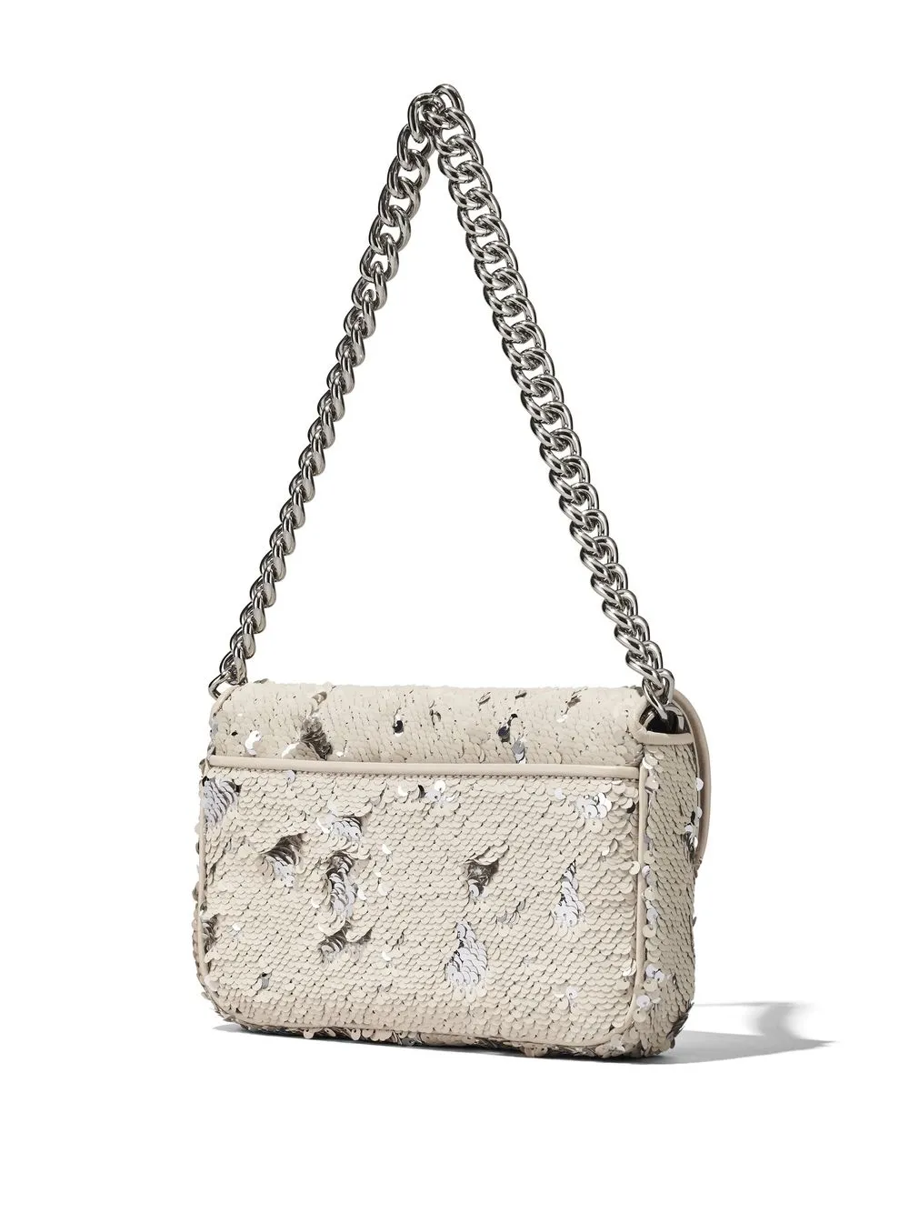Серо-бежевый, украшение из пайеток, серебристая фурнитура, металлический логотип, ремешок-цепочка на плечо, откидной клапан на магните и внутренний карман на молнии.