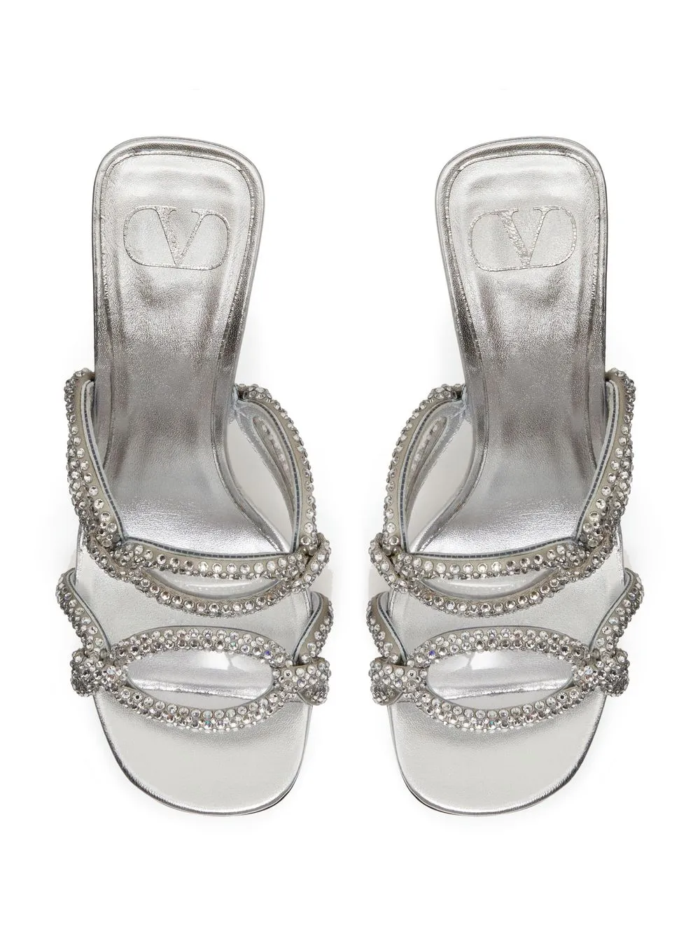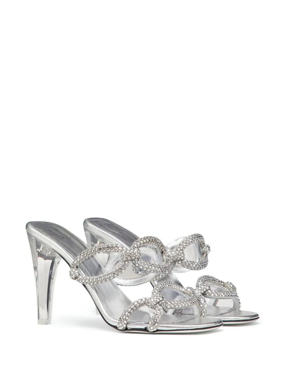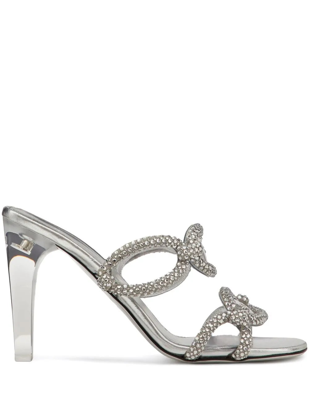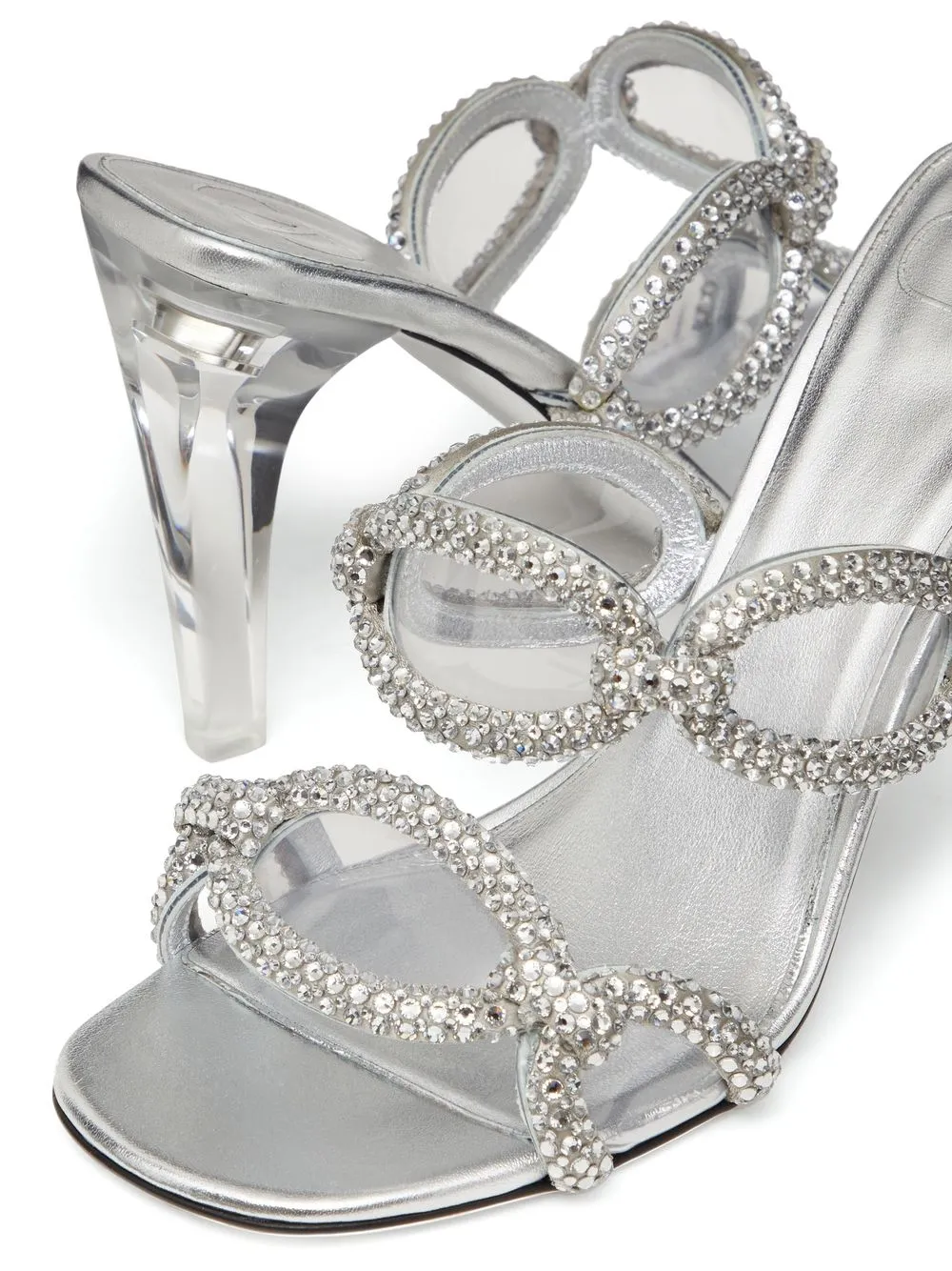 Серебристый, смесовый шелк, овечья кожа, телячья кожа, покрытие с эффектом металлик, браслет в два оборота, объемная аппликация, декор из кристаллов, открытый носок, стелька с логотипом, прозрачный блочный каблук и модель без застежки.
