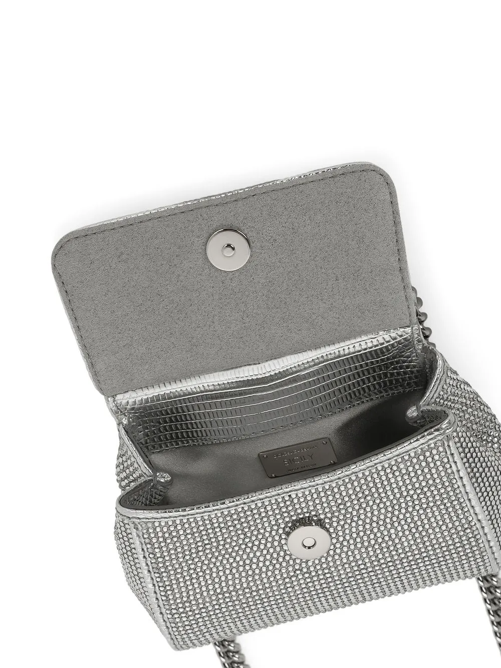 Декор из кристаллов, металлический логотип, закругленная верхняя ручка, откидной клапан на магните и ремешок-цепочка на плечо.
