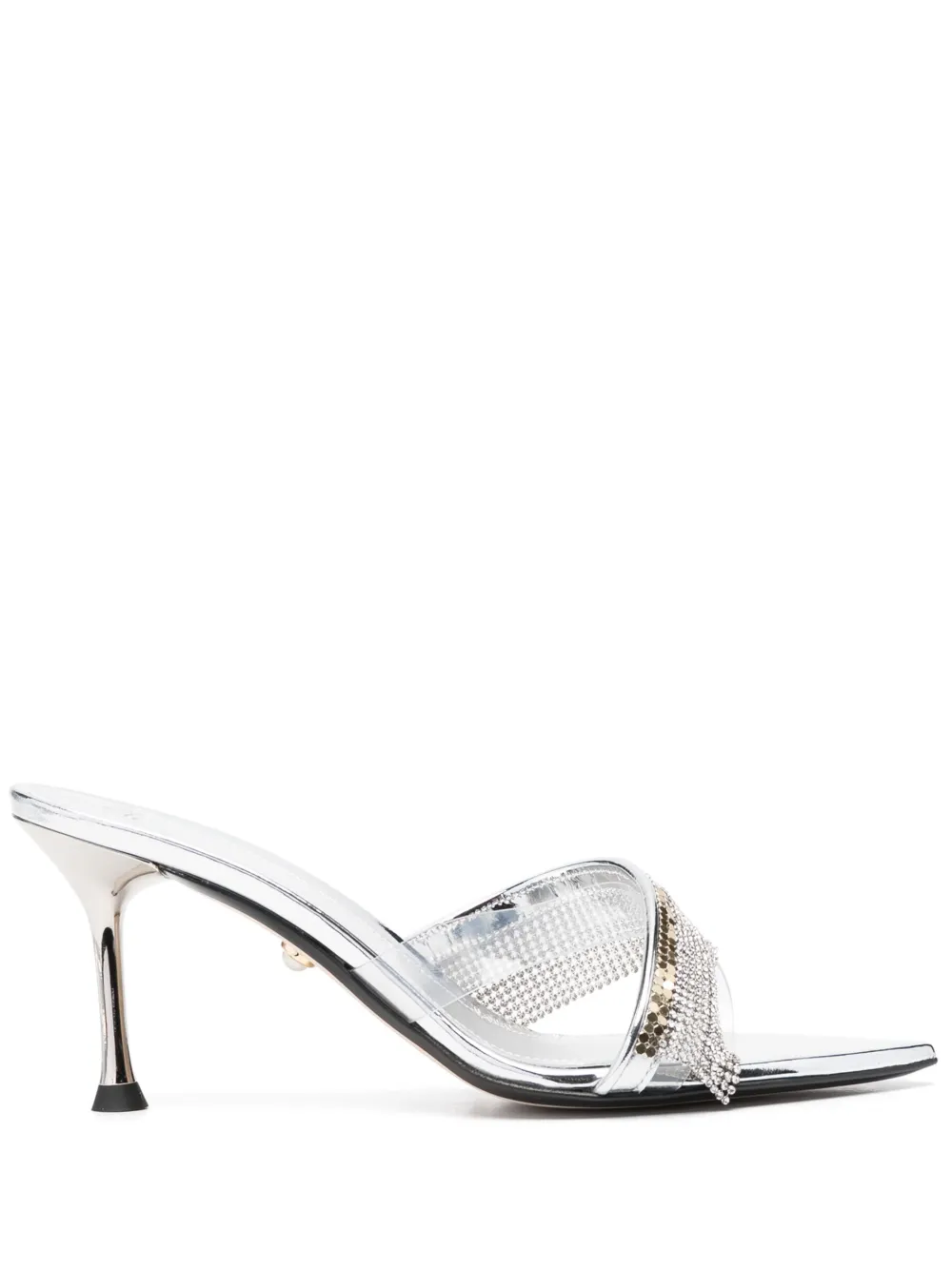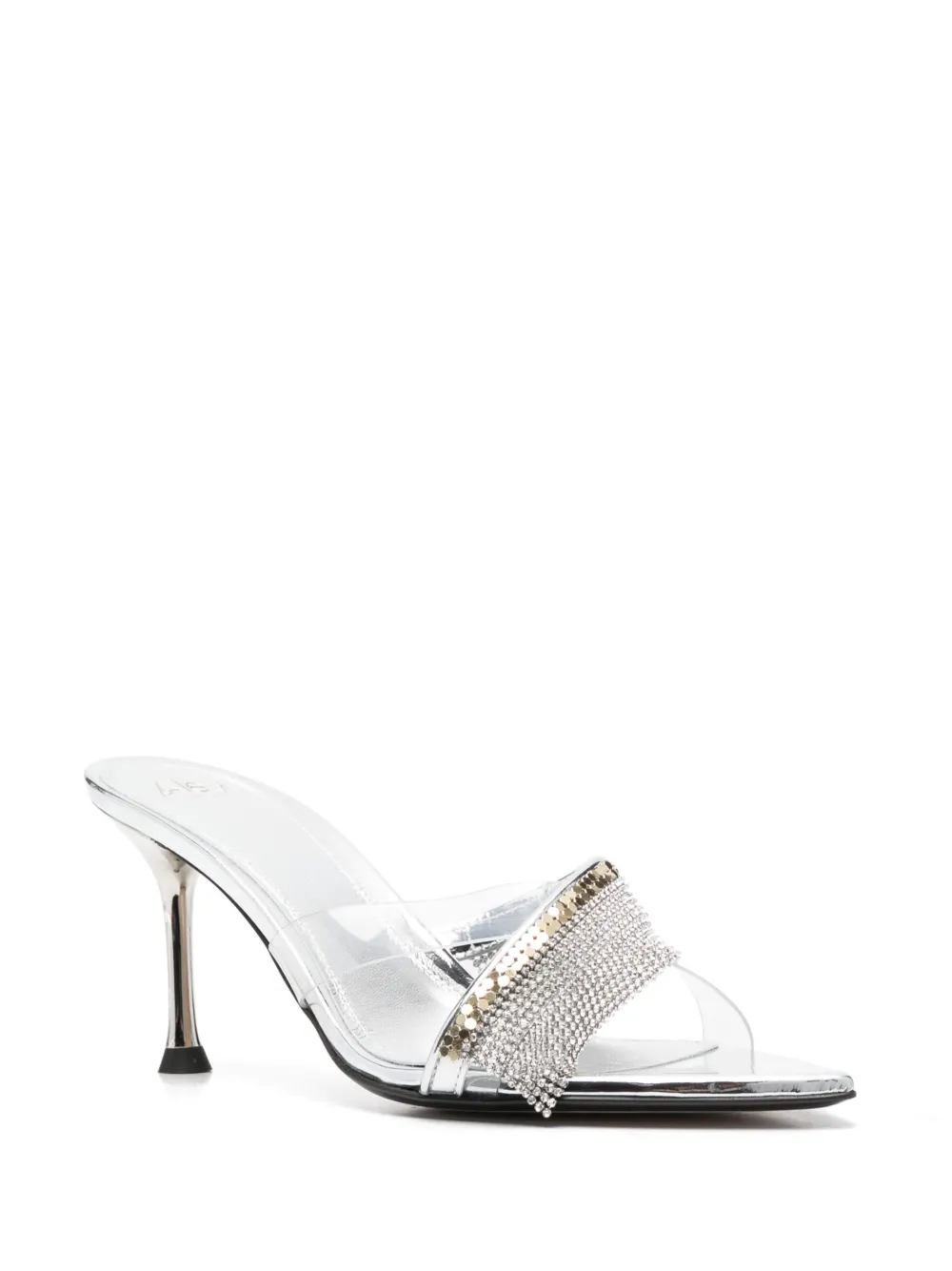 Серебристый, телячья кожа, покрытие с эффектом металлик, модель без застежки, декор из кристаллов, открытый носок, перекрестные ремешки, кожаная стелька с логотипом и высокий каблук.