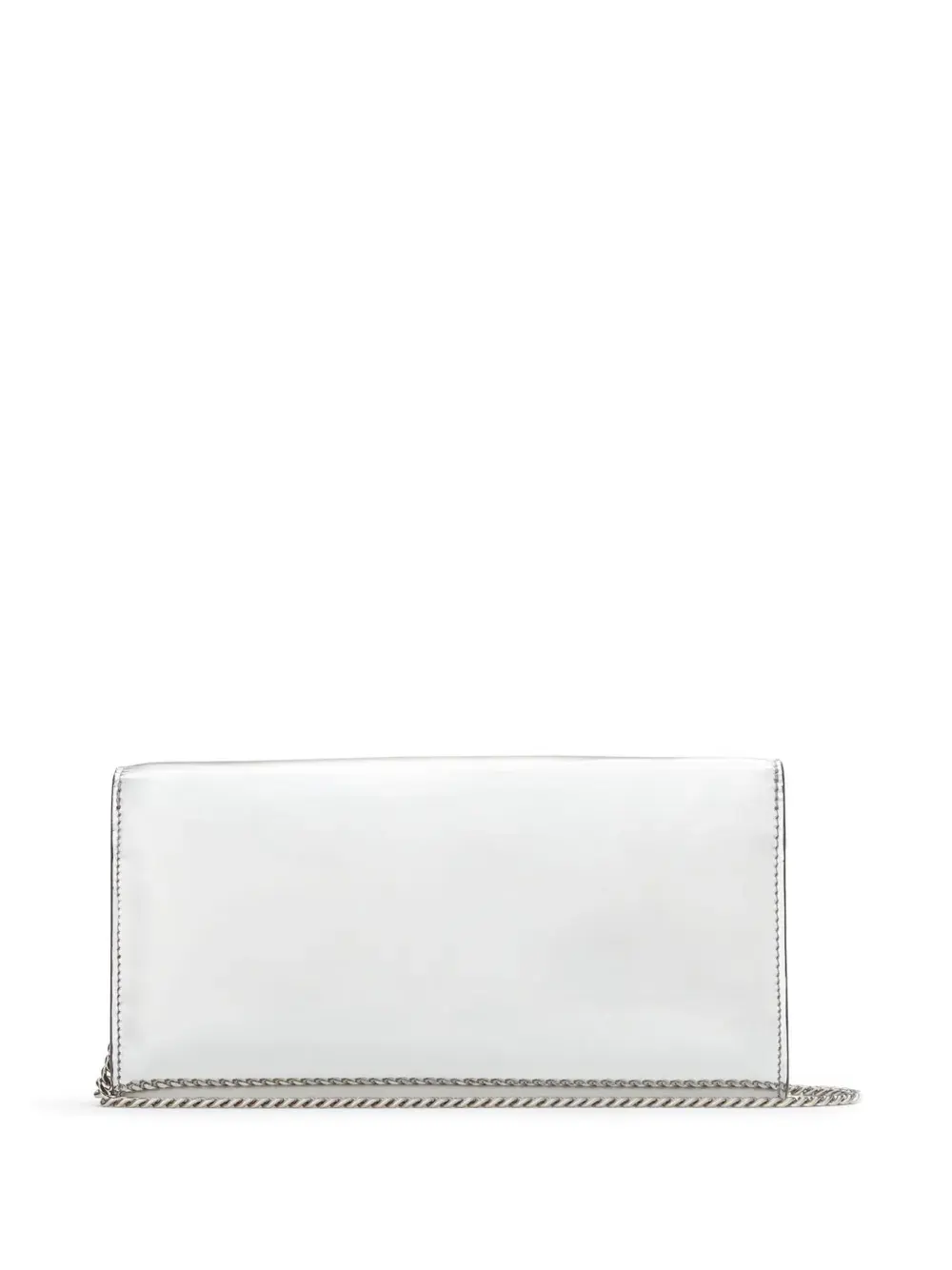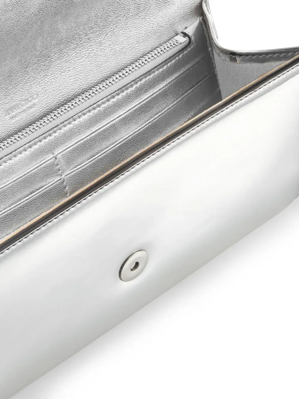 Серебристый, кожа, покрытие с эффектом металлик, серебристая фурнитура, выгравированный логотип, откидной клапан на магните, съемный цепочный ремень на плечо, внутренние отделения для карт и тисненый логотип внутри.