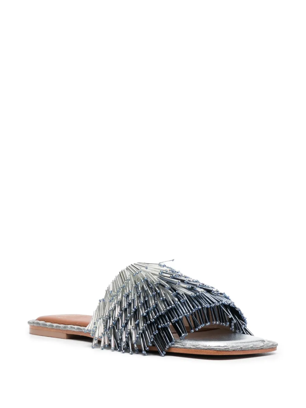 Серебристый, телячья кожа, декор из бисера, эффект омбре, открытый носок, низкий блочный каблук, кожаная стелька с логотипом и модель без застежки.