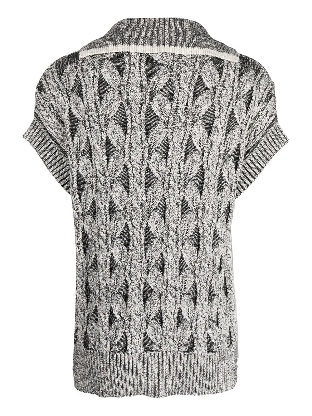 Серый, хлопок, крупная вязка, V-образный вырез, короткие рукава и подол в рубчик.