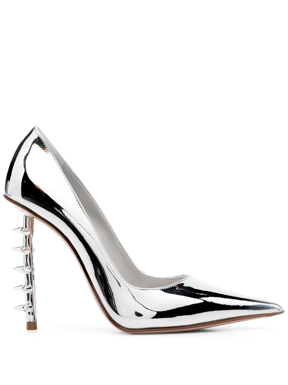 Серебристый, телячья кожа, покрытие с эффектом металлик, заклепки Rockstud, заостренный носок, модель без застежки, кожаная стелька с логотипом и каблук на высокой шпильке.