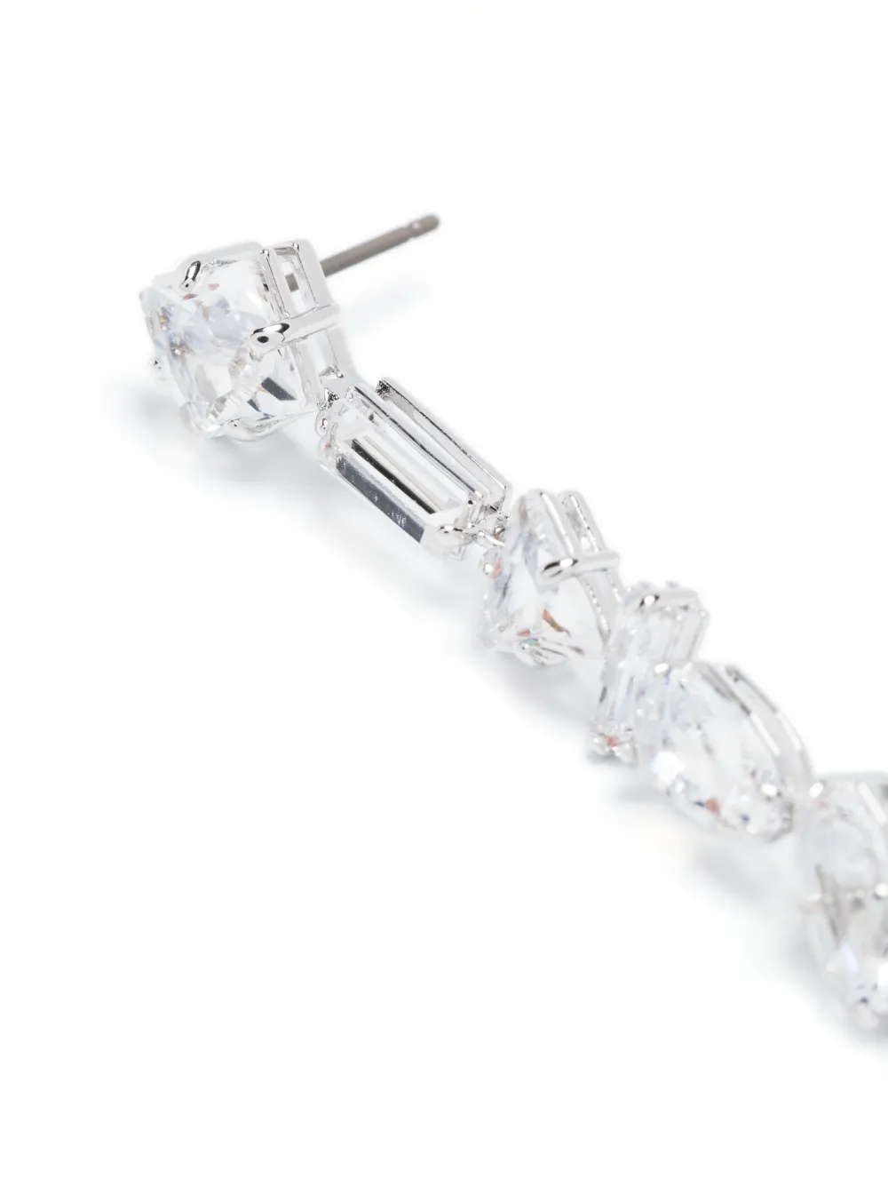 Серебристый, латунь, отделка кристаллами Swarovski, серьги-подвески, огранка «принцесса», крой по косой, огранка «багет» и для проколотых ушей. В комплект входят две серьги. Этот товар доставят в подарочной упаковке.
