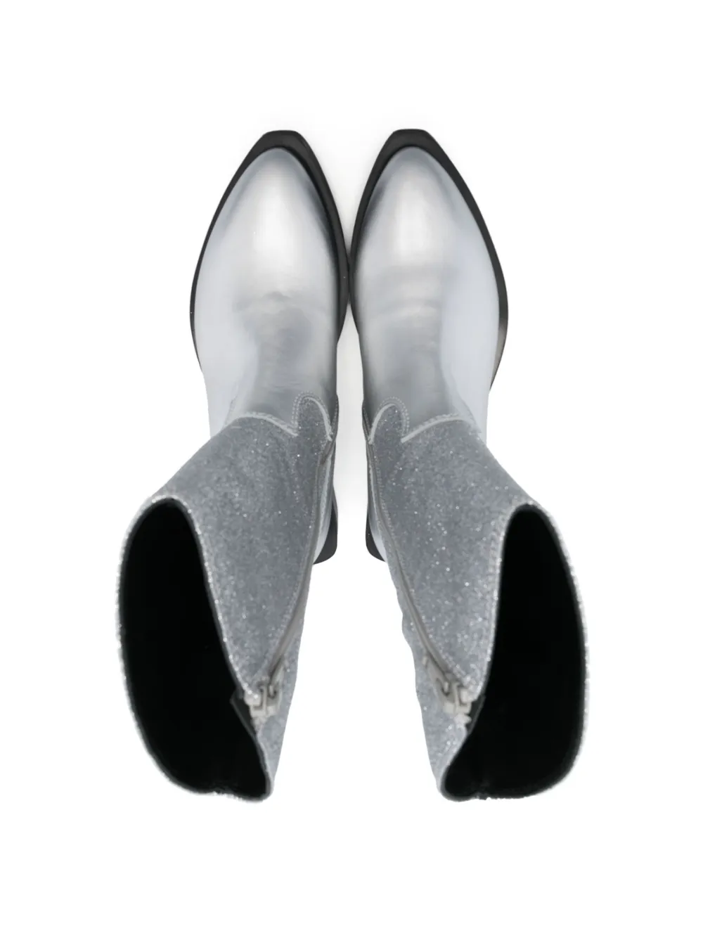 Серебристый, черный, телячья кожа, блестящий материал, вышитый логотип сбоку, заостренный носок, застежки на молнии сбоку, стелька с логотипом и блочный каблук.