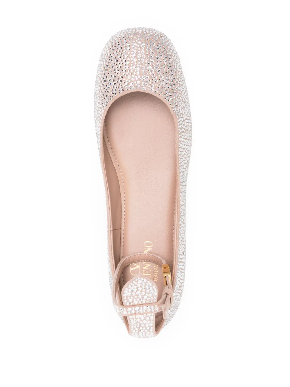 Светло-розовый, телячья кожа, декор из кристаллов, закругленный носок, ремешок на щиколотке с пряжкой и плоская кожаная подошва.