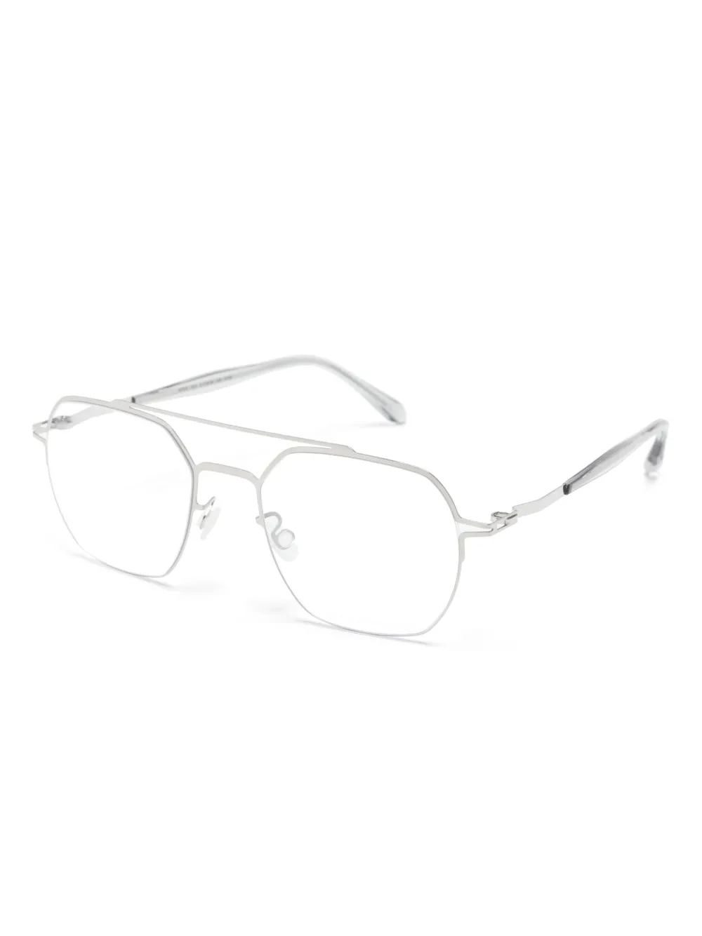 Металл, серебристый, оправа «пилот», прозрачные линзы, двойной мост, носоупоры, прямые дужки и дужки с закругленными концами. Обратите внимание, что на FARFETCH продаются оправы с линзами без диоптрий. В комплект входит защитный чехол для очков.