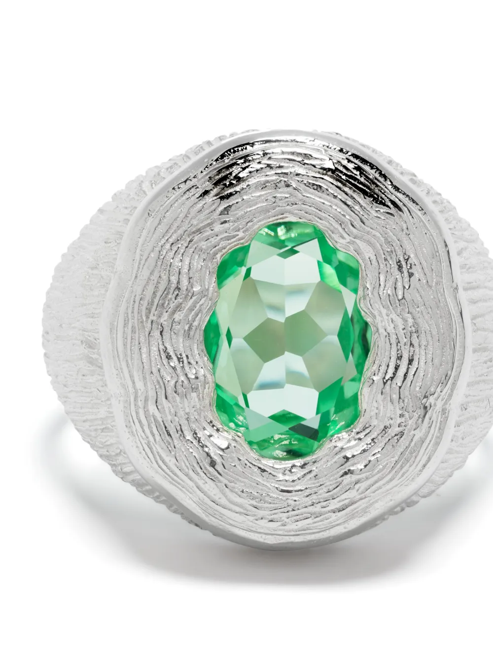 Серебро 925 пробы, зеленый сапфир, фактурная отделка и модель без застежки. Клеймо пробирной палаты Лондона. Узнать больше о том, какие товары получают отметку «Ответственный выбор», можно из материала «Как мы оцениваем экологичность и этичность».