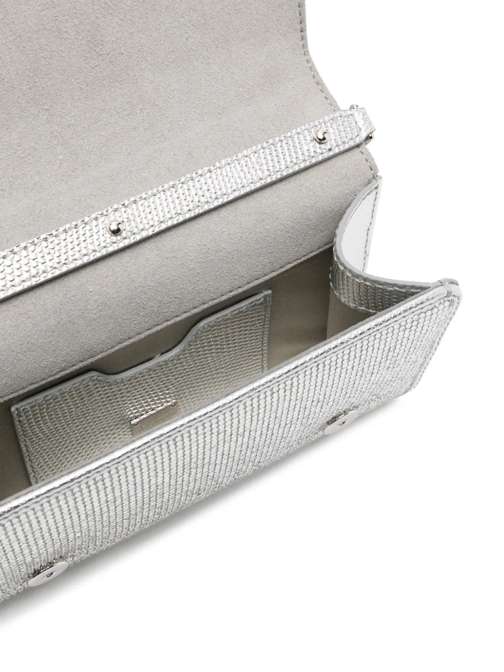 Подробнее о товаре: • серебристый • телячья кожа • кристаллы • серебристый металлический логотип • откидной верх • съемный цепочный ремень на плечо • цельная подкладка • металлический логотип внутри • внутреннее отделение для карт • основное отделение • серебристая фурнитура • К этому товару прилагается сертификат подлинности.