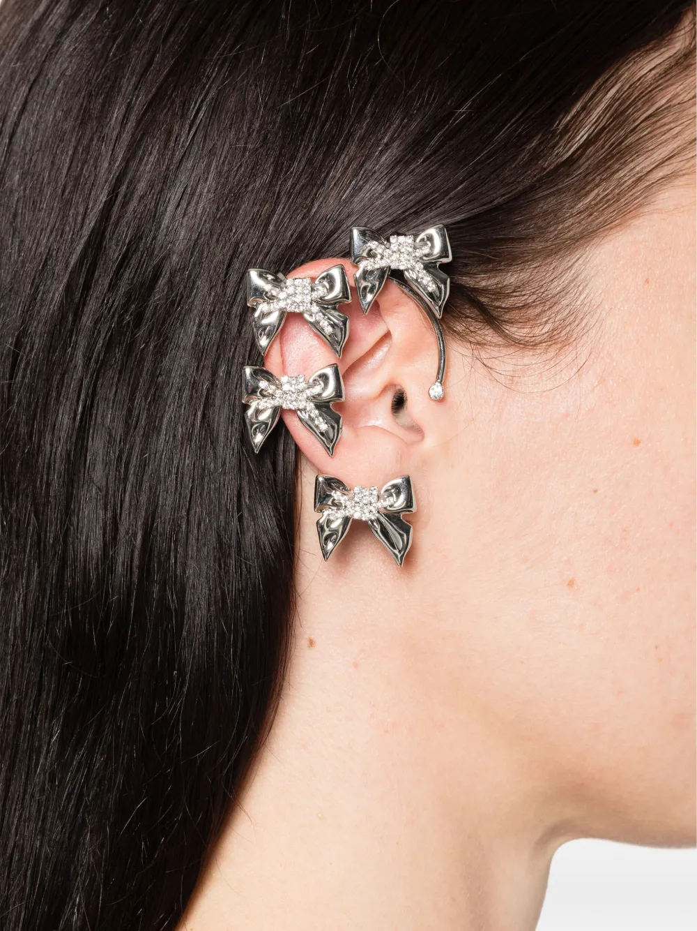 Серьга-кафф в виде банта серебристого тона с кристаллами паве. Это одиночная серьга для правого уха.