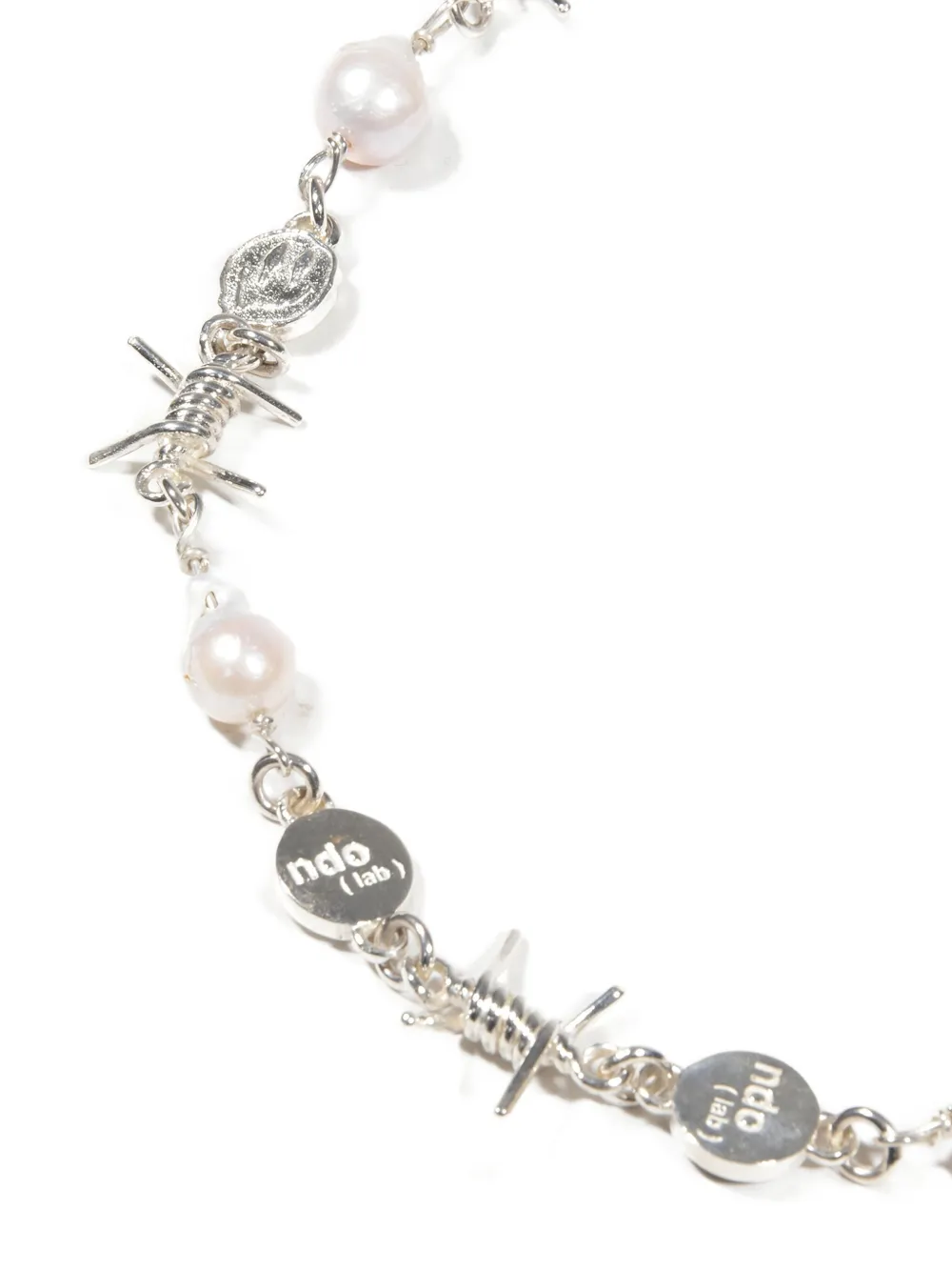 Серебристые жемчужины, детали из колючей проволоки, круглые бляшки с логотипом, застежка-застежка