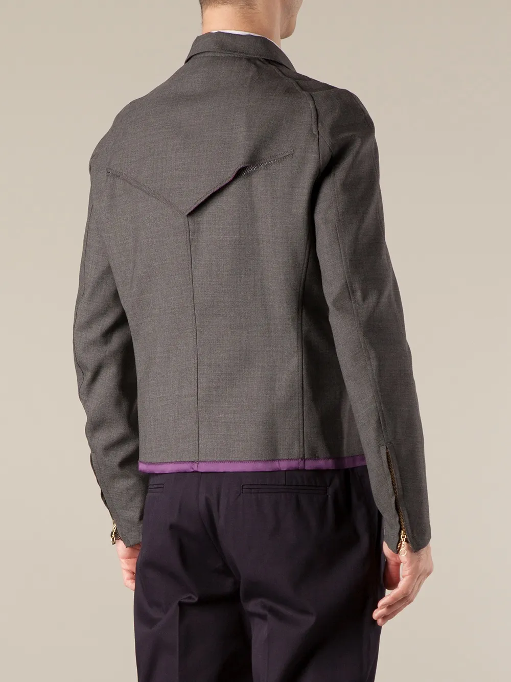 Серая шерстяная куртка с декоративной отделкой от Kolor. Классический воротник, застежка на молнии спереди, карманы на молнии сбоку, длинные рукава, манжеты на молнии.