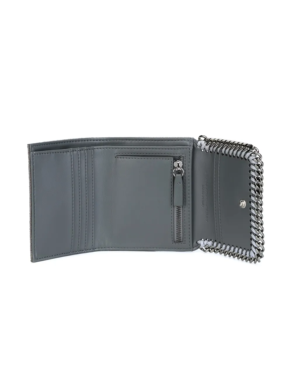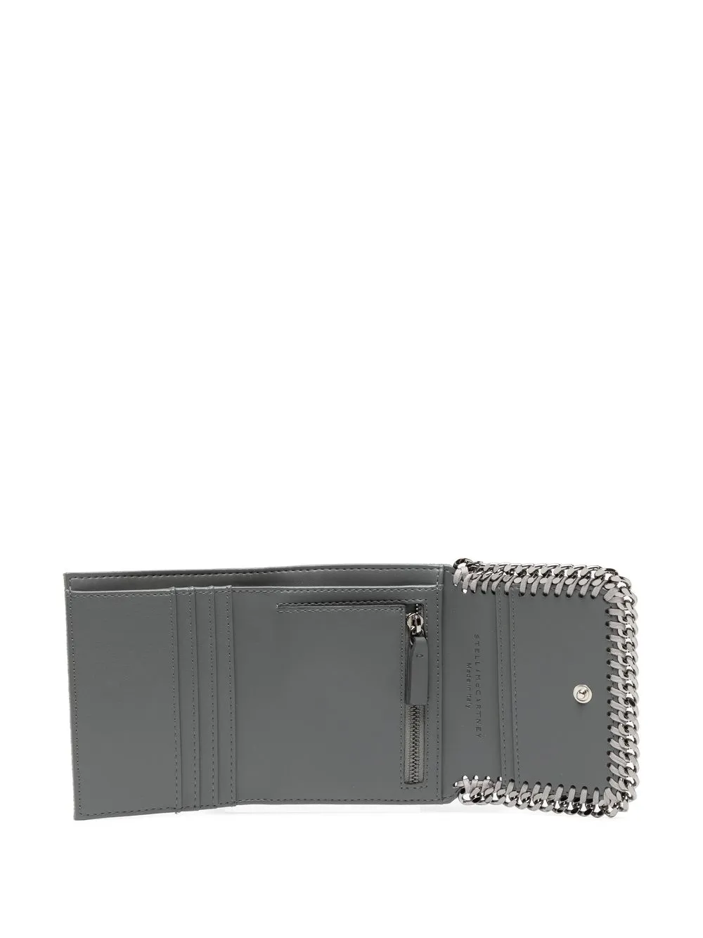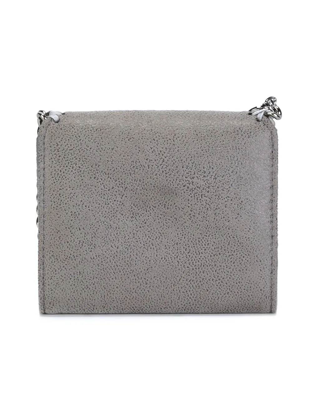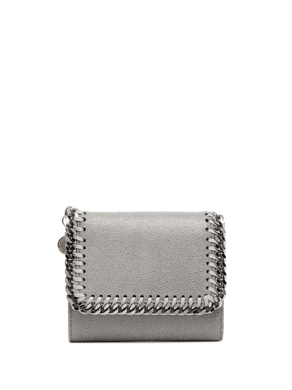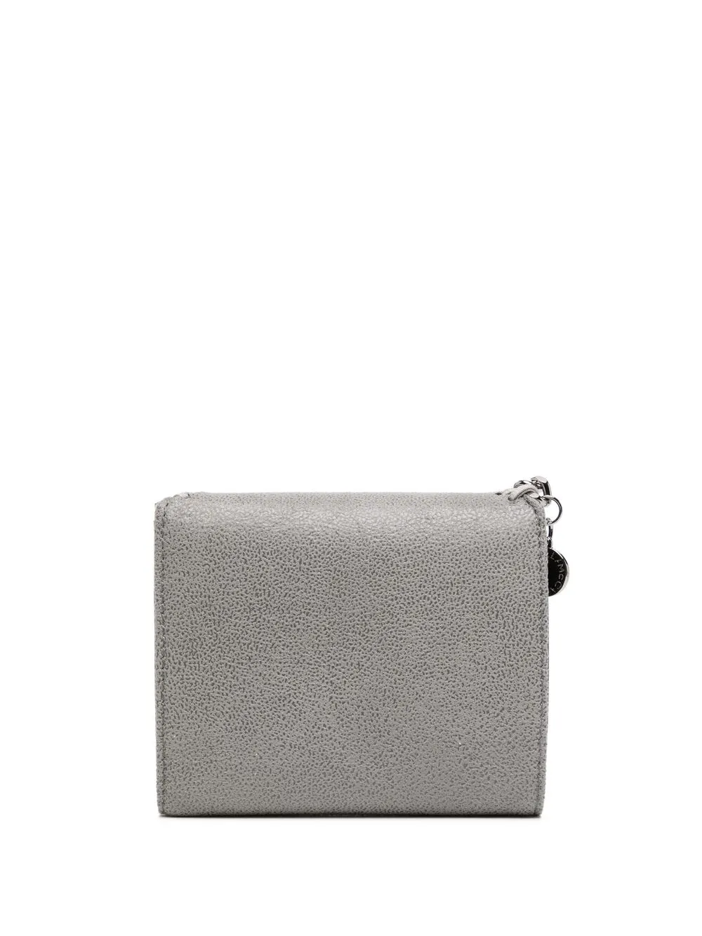 Серый кошелек ‘Falabella’ от Stella McCartney. Откидной верх с застежкой-защелкой, серебристая отделка с цепочкой, несколько отделений для карточек, внутренний карман на молнии, отделение для купюр, внутренняя печать с тисненым логотипом.