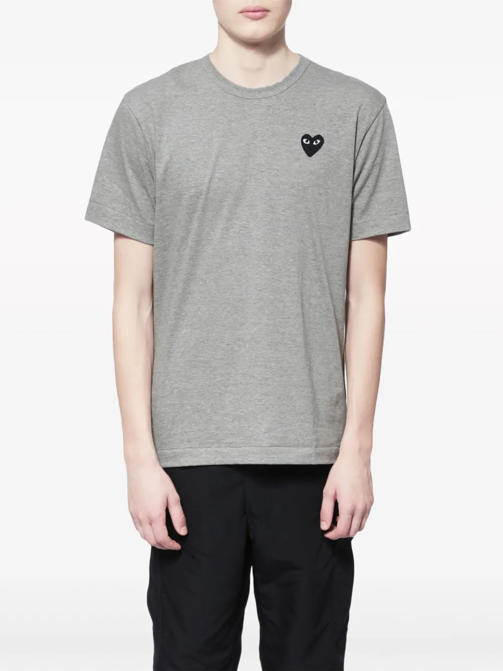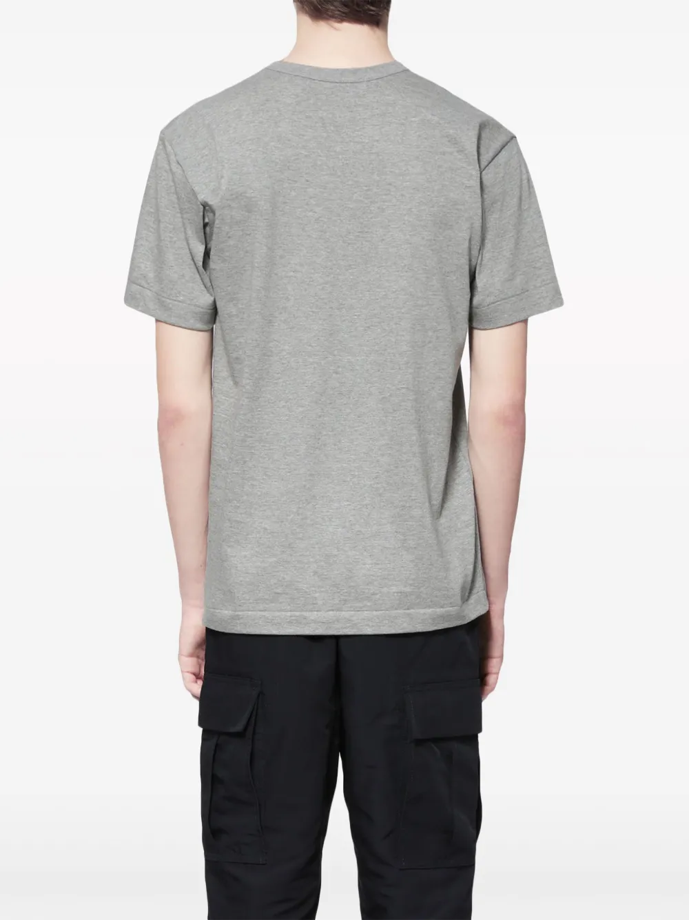 Серая хлопковая футболка с заплаткой в форме сердца от Comme Des Garçons Play. Круглый вырез, короткие рукава, контрастный вышитый логотип на груди, прямой подол.