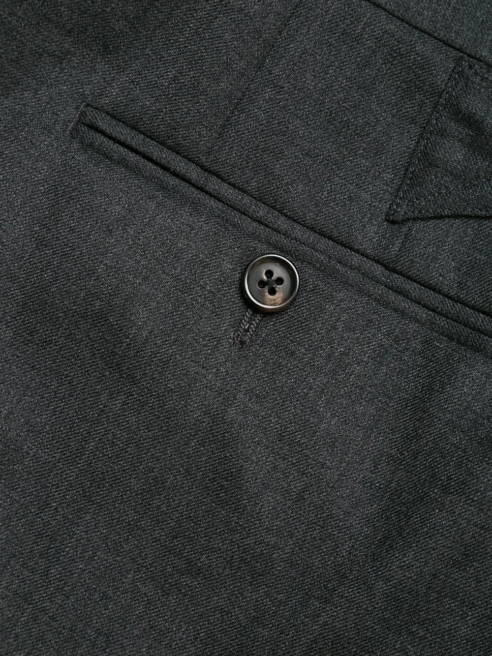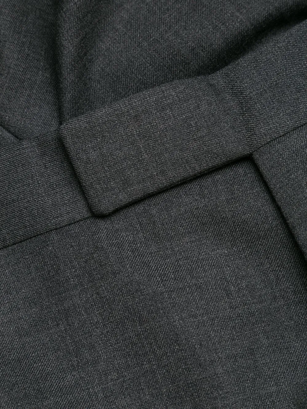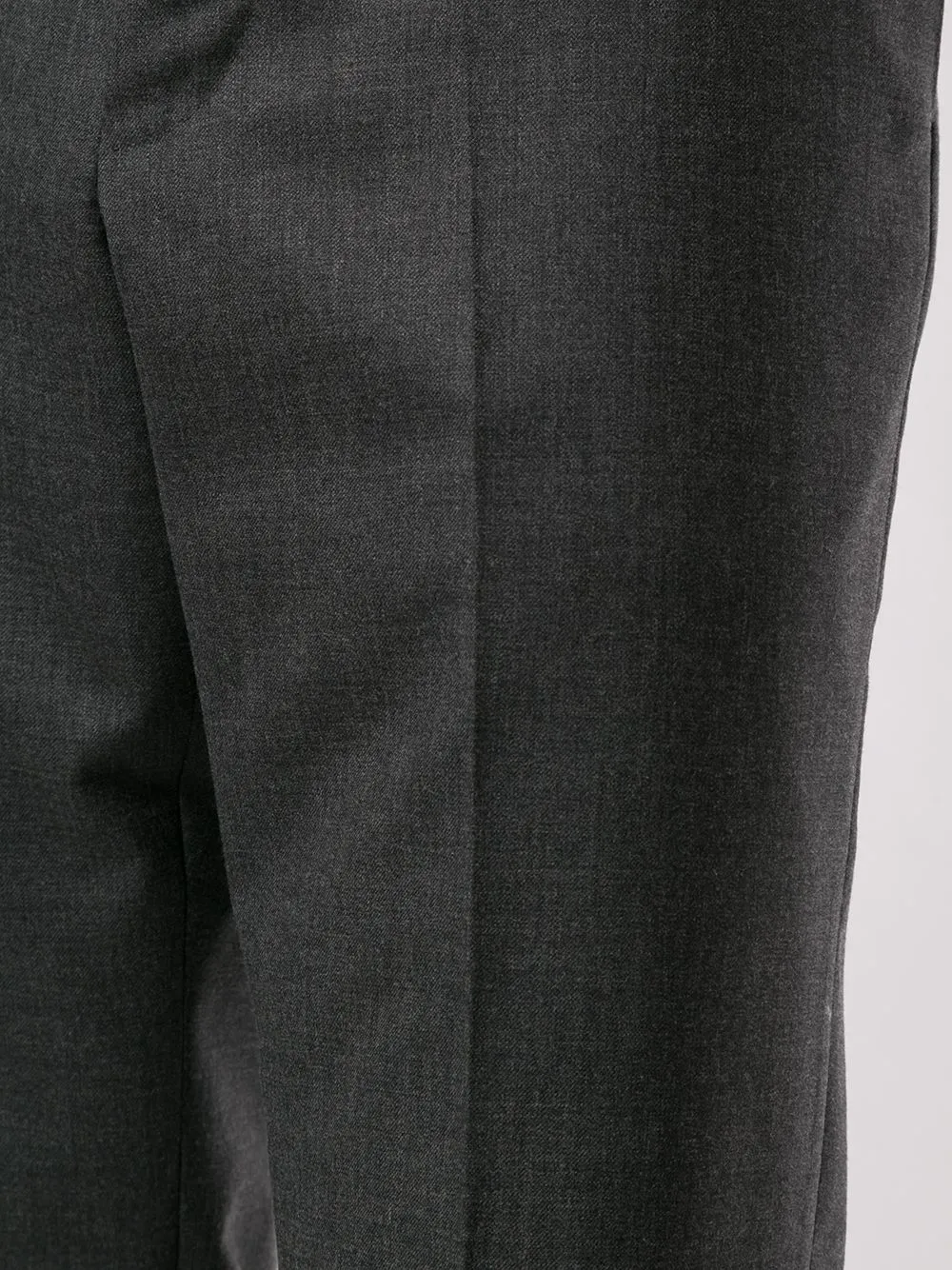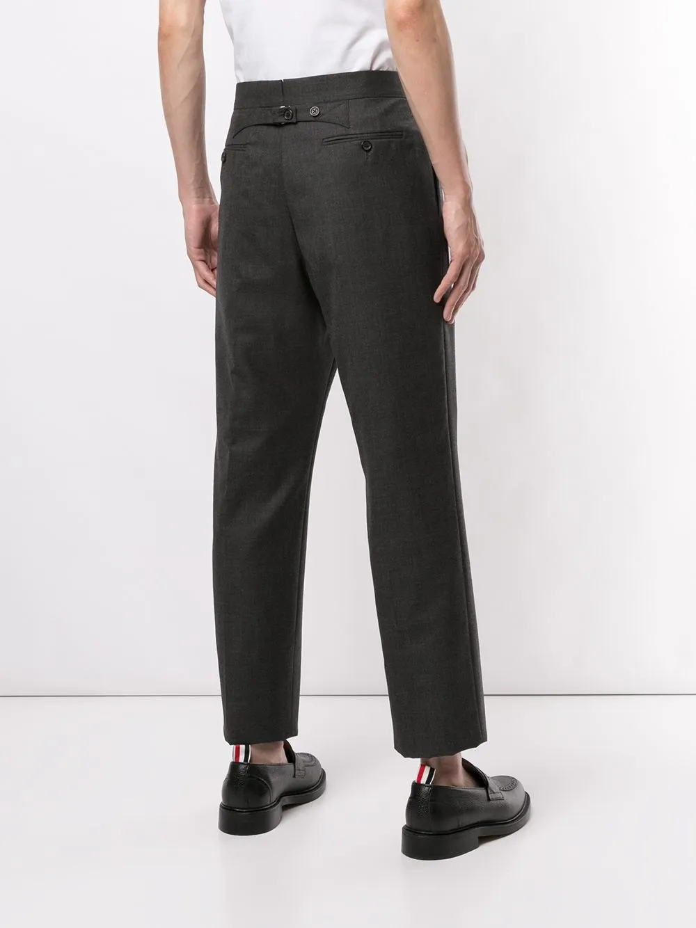 Твиловые брюки от THOM BROWNE. Прямые брючины, завышенная посадка, потайная застежка спереди, ремешок сзади, два задних прорезных кармана на пуговицах, подвернутый подол и укороченная длина.