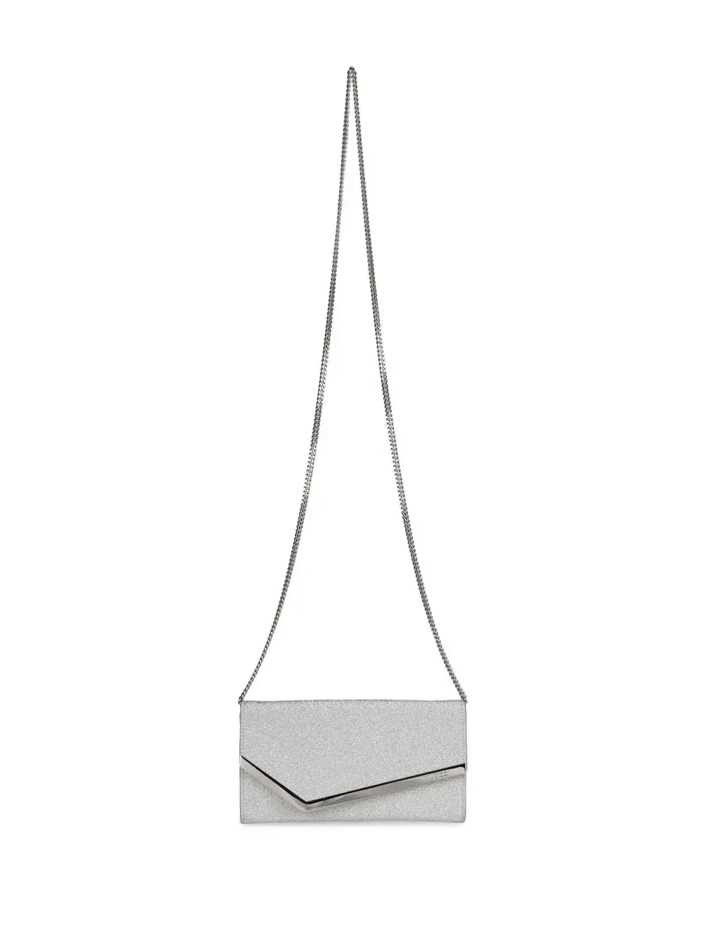Серебристый клатч 'Emmie' из телячьей кожи от Jimmy Choo(Джимми Чу). Откидной клапан на магните, несколько внутренних отделений для карточек, внутренний отдел на молнии, цепочная лямка на плечо, форма конверт.