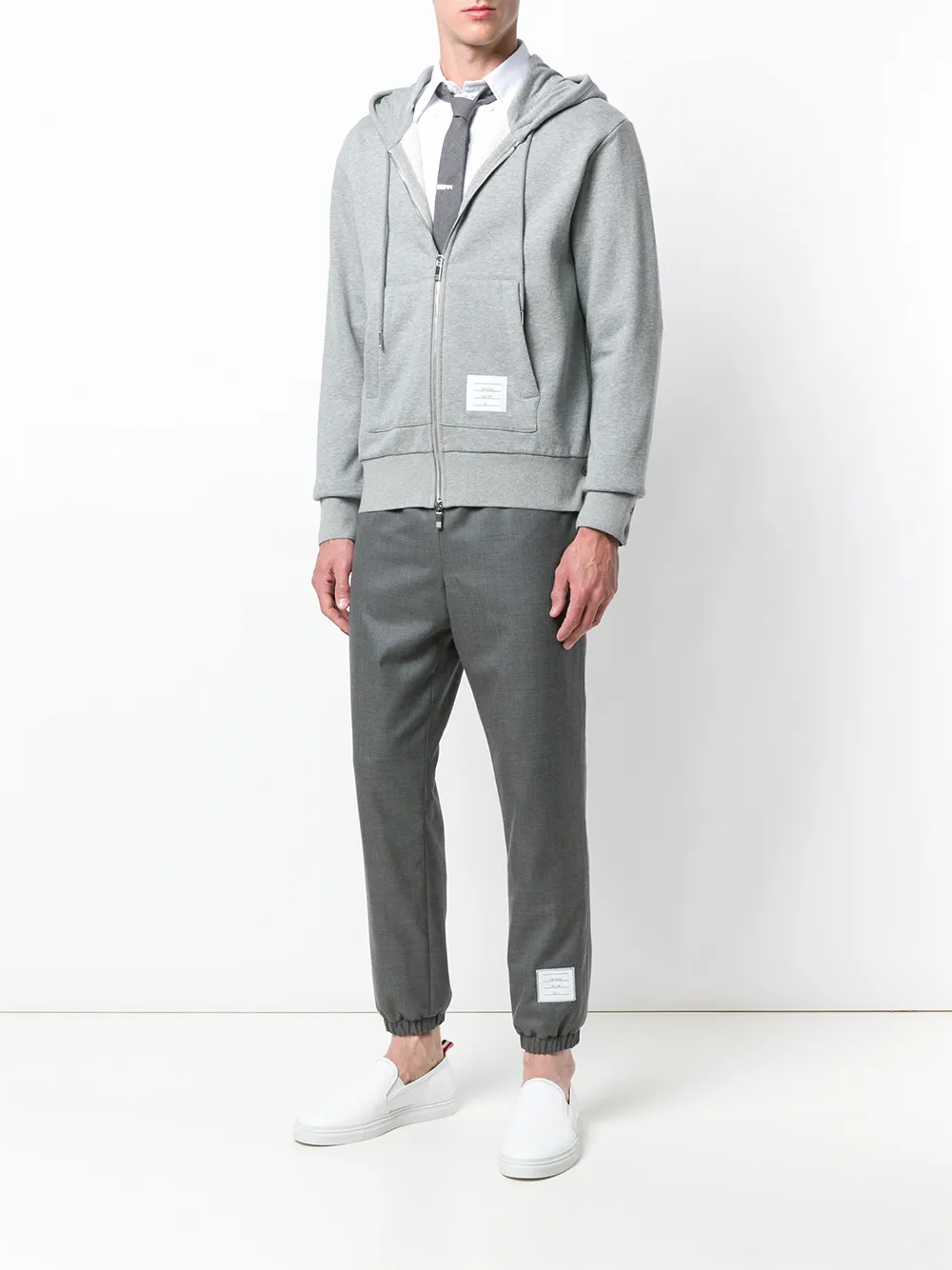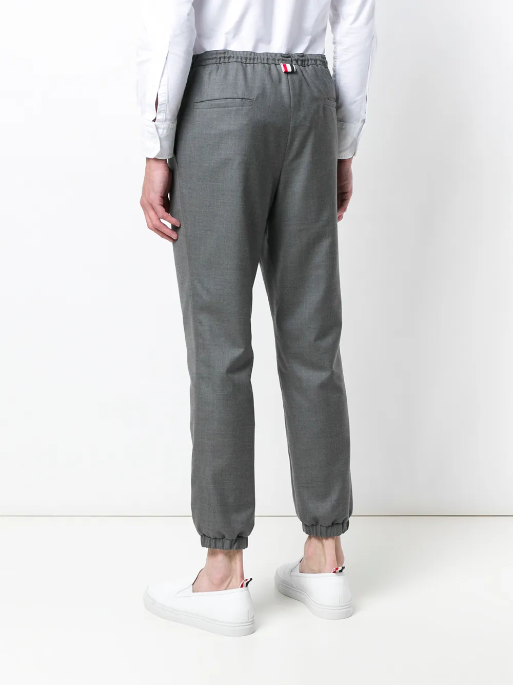 Спортивные брюки с эластичными манжетами от Thom Browne (Том Браун). Талия на эластичном шнурке, свободный силуэт, сужающиеся к низу брючины, присборенные щиколотки, боковые карманы, задние карманы с листочкой, заплатка с логотипом спереди и фирменная трехцветная полоска. Цвет: серый.