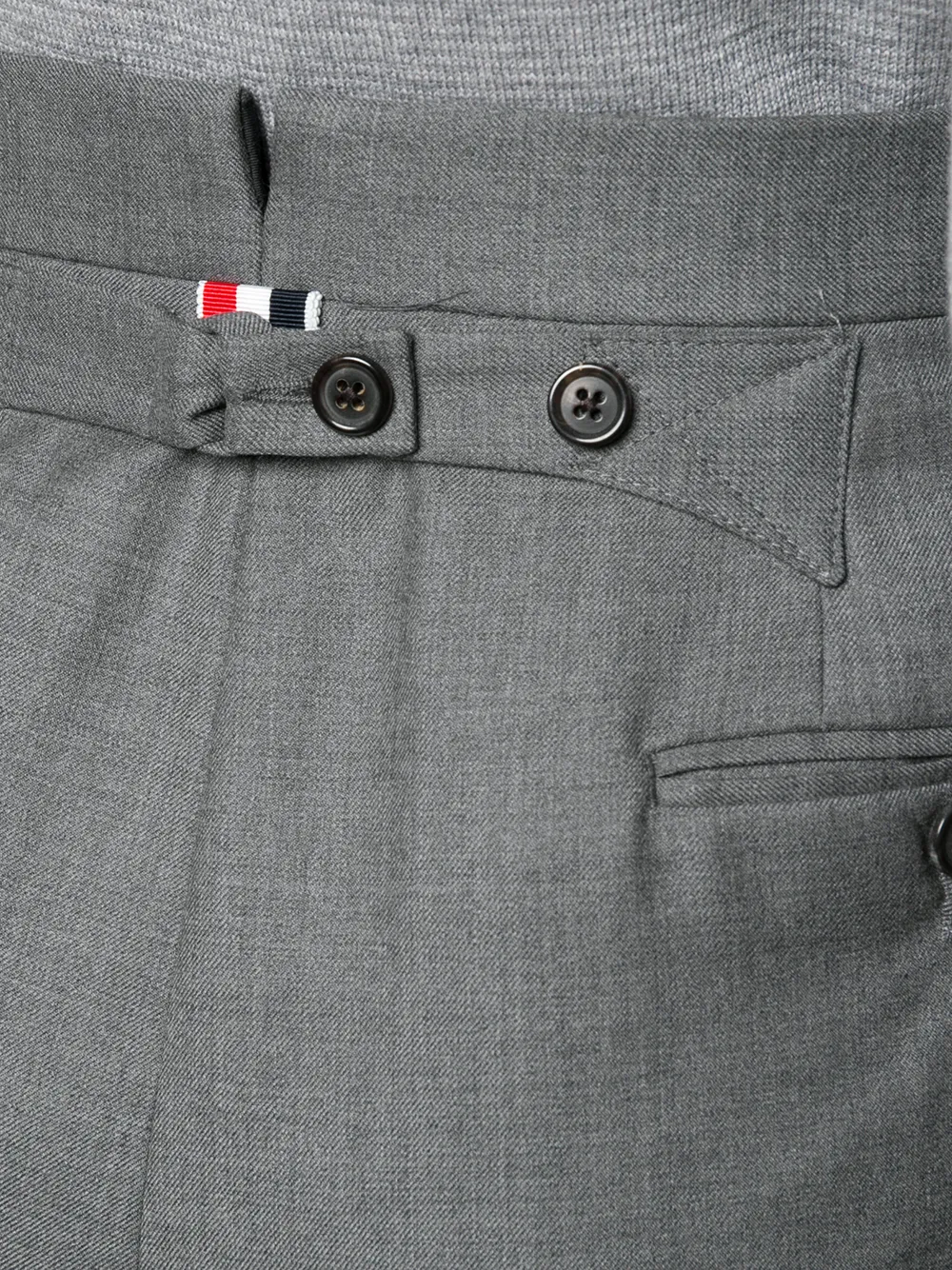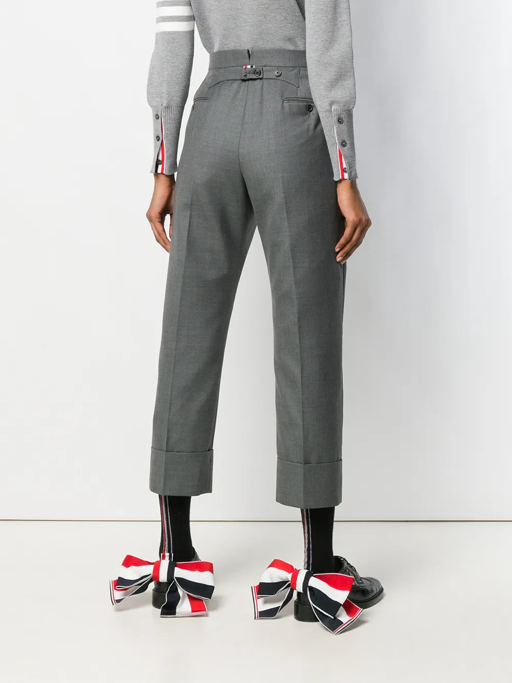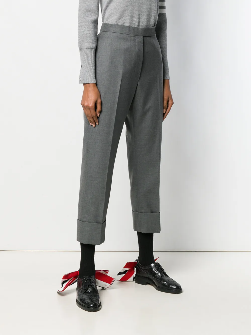 Брюки Super 120s от THOM BROWNE. Завышенная талия, потайная застежка спереди, задние карманы с листочкой, подвернутый подол и укороченная длина. Размер отличается от стандартного. Рекомендуем покупку на полразмера меньше..