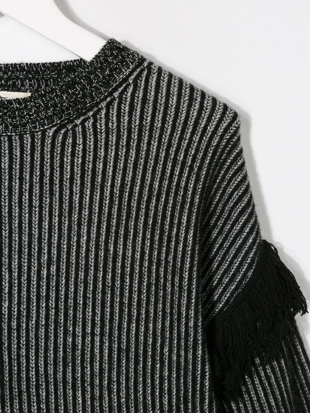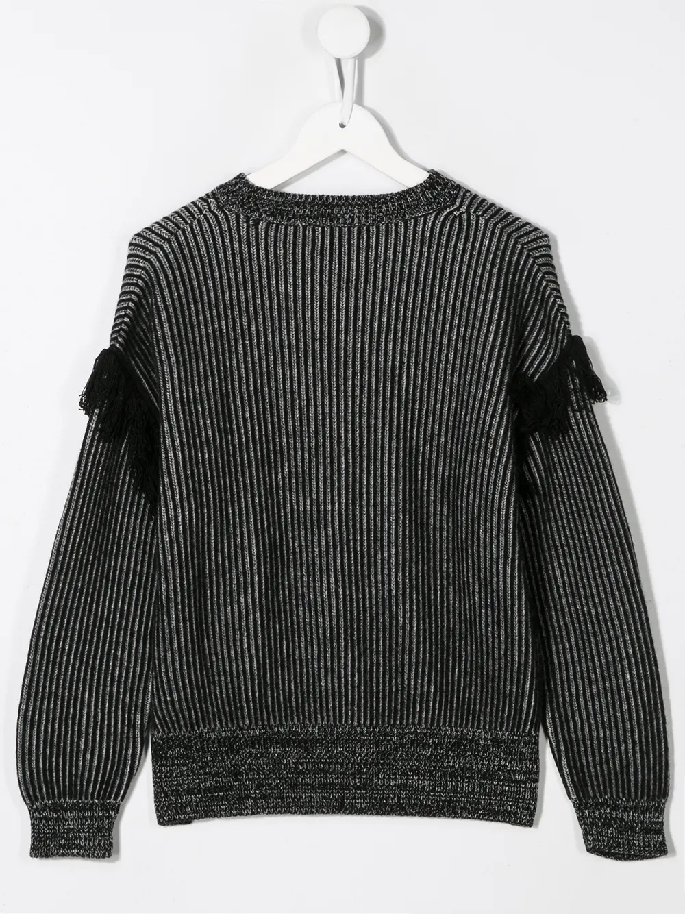 Джемпер в рубчик с бахромой от Andorine. Круглый вырез, ребристая вязка, длинные рукава, детали с бахромой и подол и манжеты в рубчик. Цвет: черный.