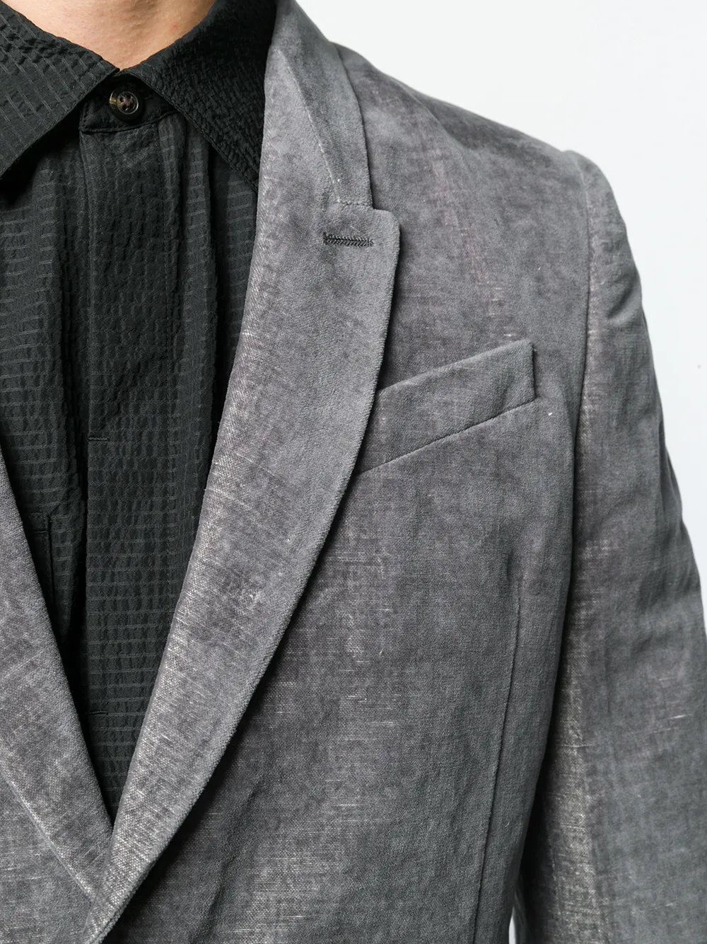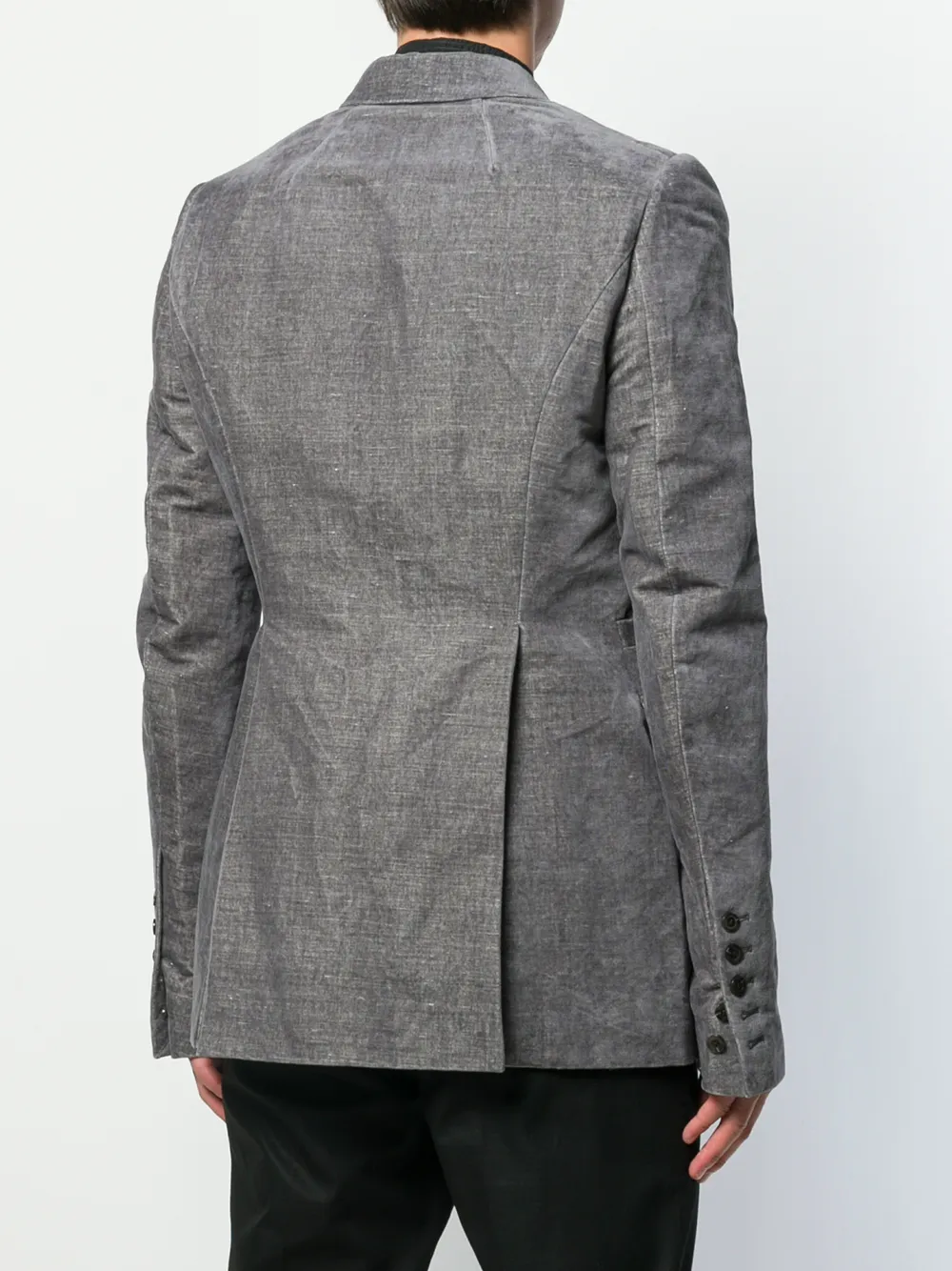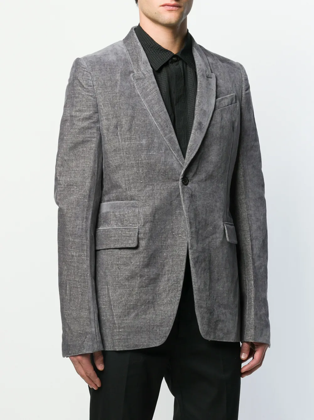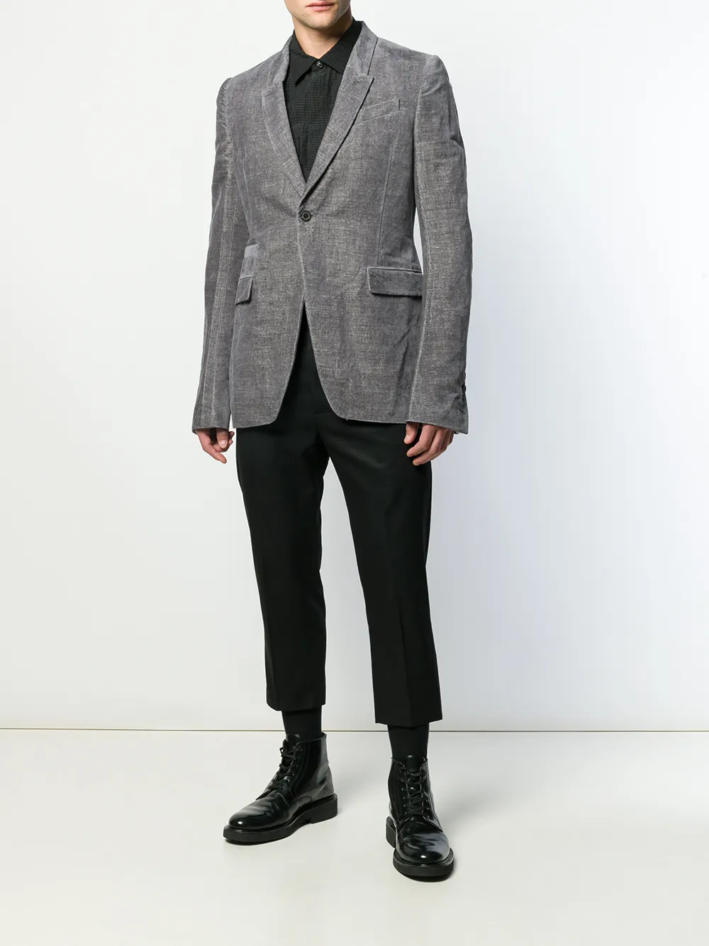Бархатный блейзер от Rick Owens (Рик Оуэнс). Лацканы-шалька, потайной карман спереди, застежка на пуговицы, длинные рукава и два передних кармана. Цвет: серый.