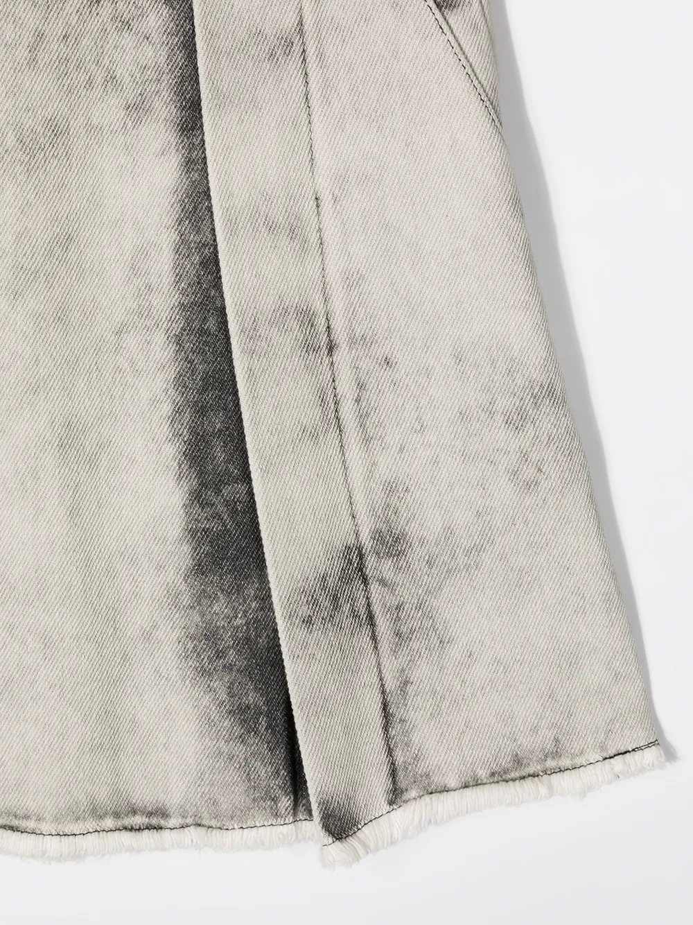 Эффект потертости, необработанные края, застежки на молнии сбоку и два кармана на молнии по бокам.