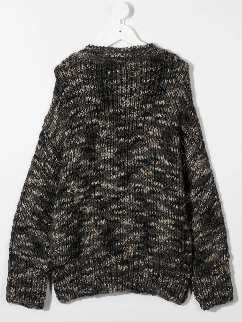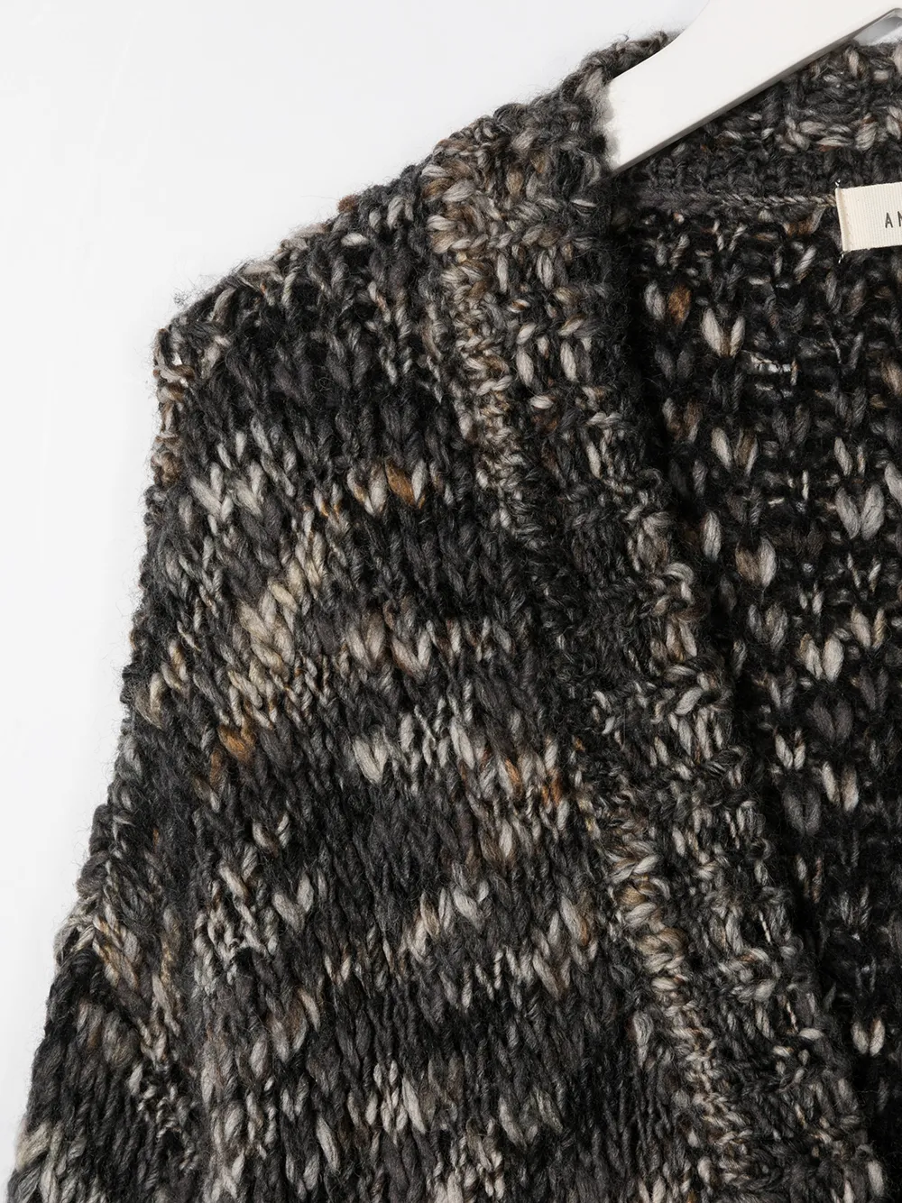 Крупная вязка, V-образный вырез, застежка на пуговицах спереди, длинные рукава и прямой подол. Цвет: серый.