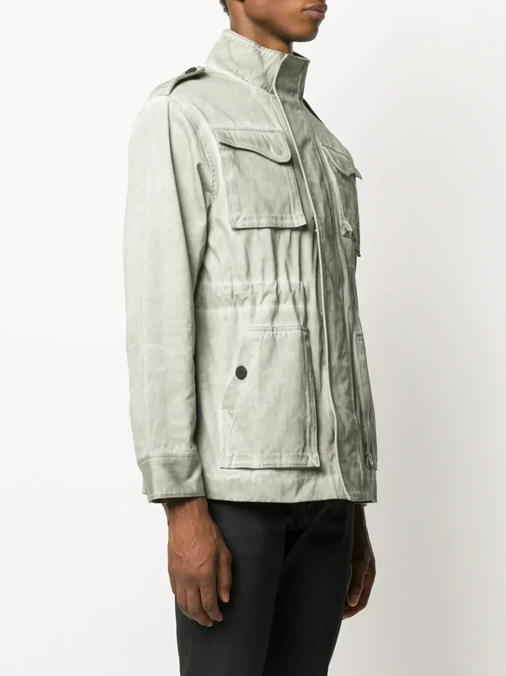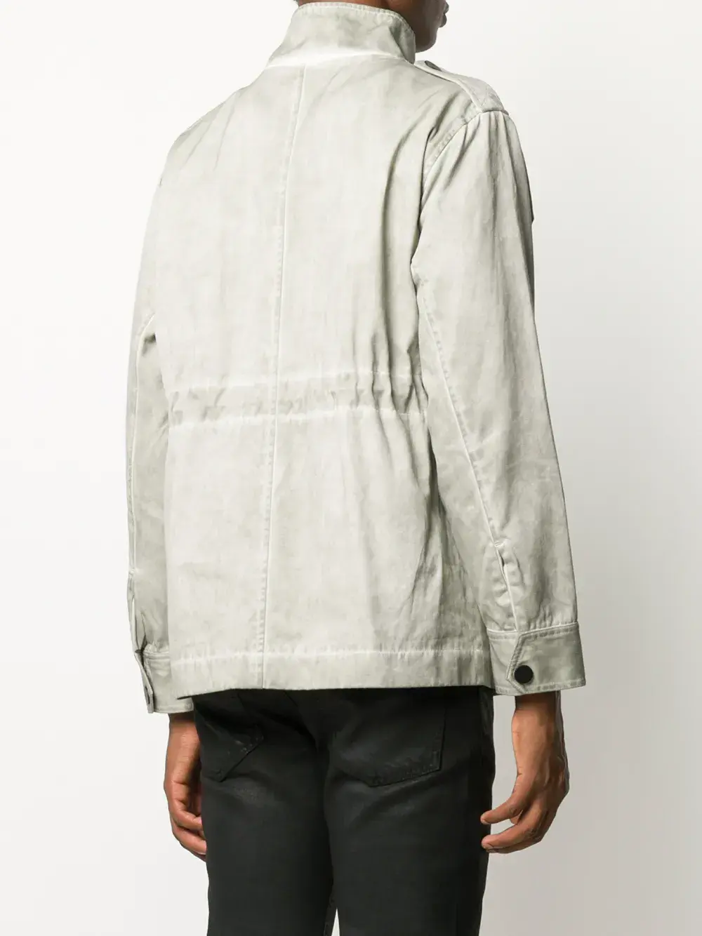 Круглый вырез, длинные рукава, потайная застежка спереди, два накладных кармана на груди и два прорезных кармана по бокам. Цвет: серый.