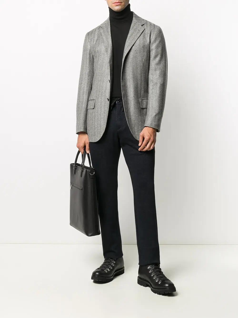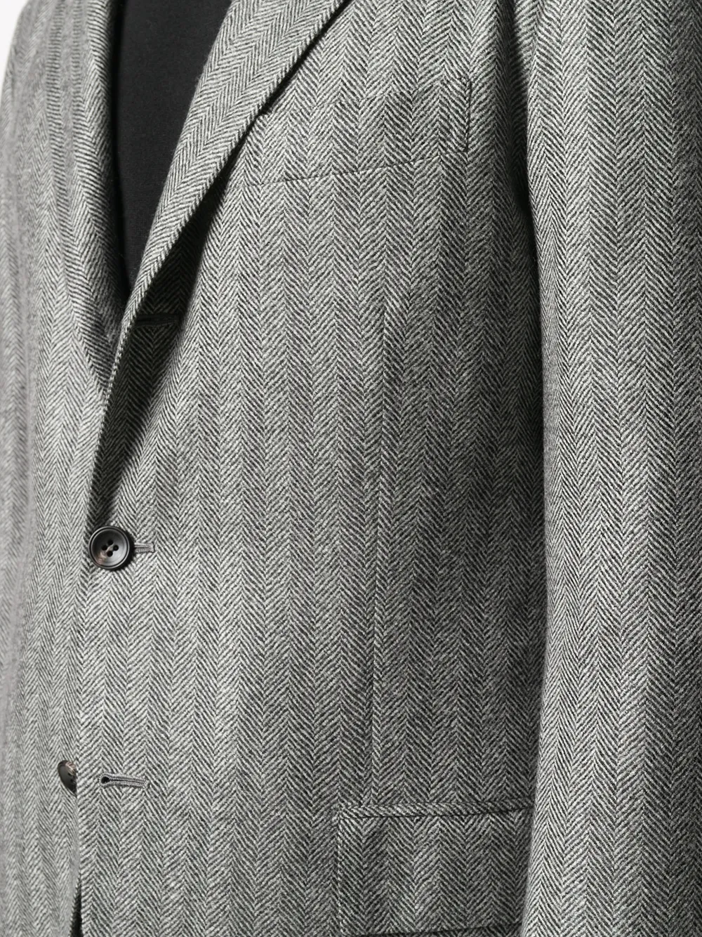 Классические лацканы, застежка на пуговицах спереди, длинные рукава, прорезной карман на груди и два передних кармана с клапанами. Цвет: серый.