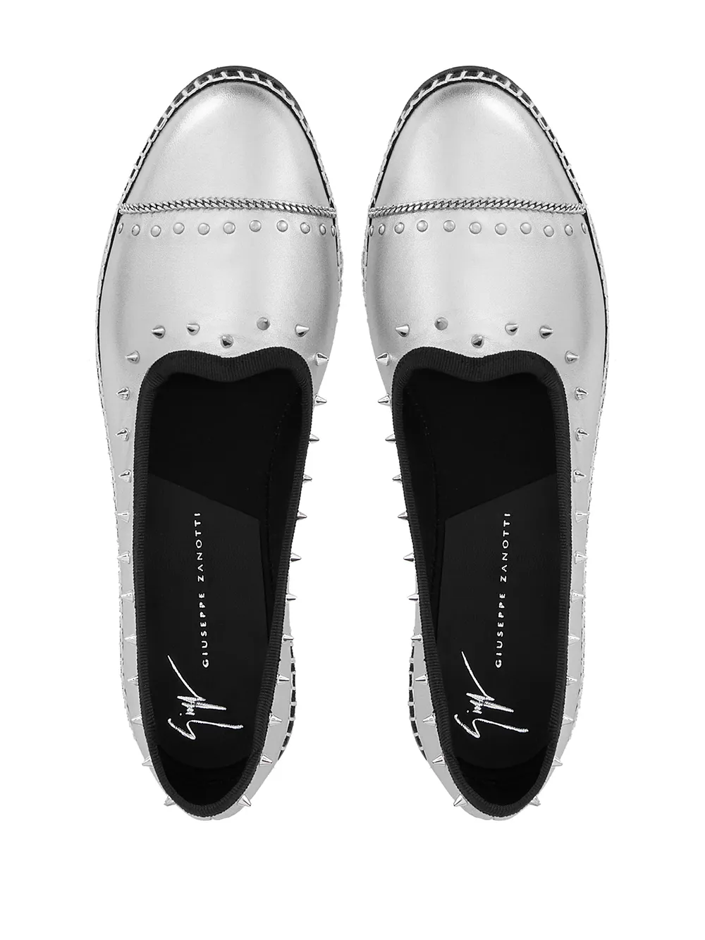 Покрытие с эффектом металлик, контрастная строчка, заклепки-шипы, закругленный носок, стелька с логотипом и плоская резиновая подошва.