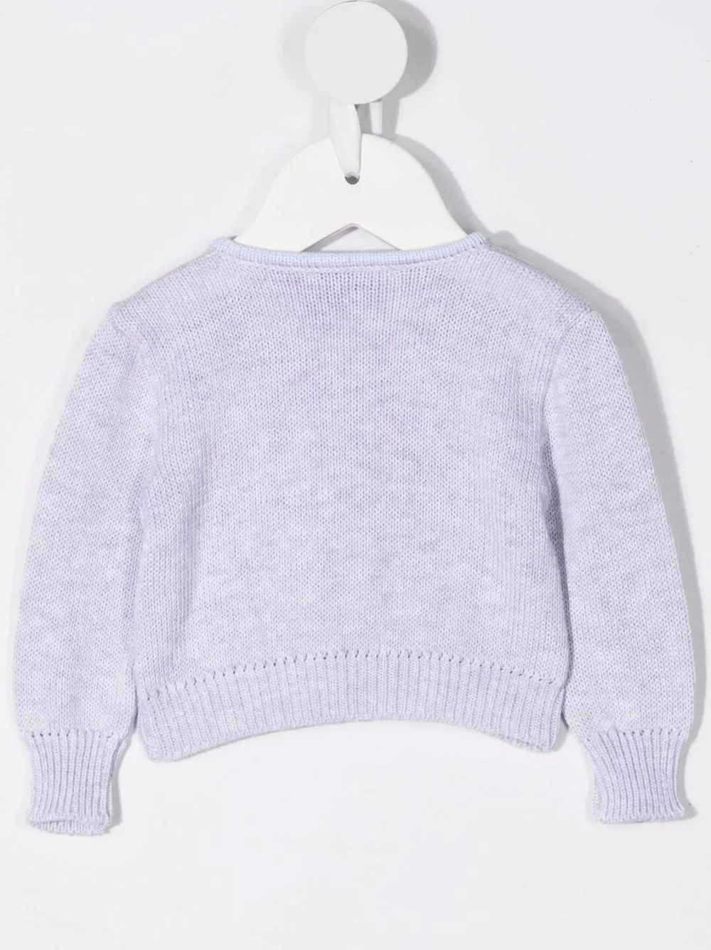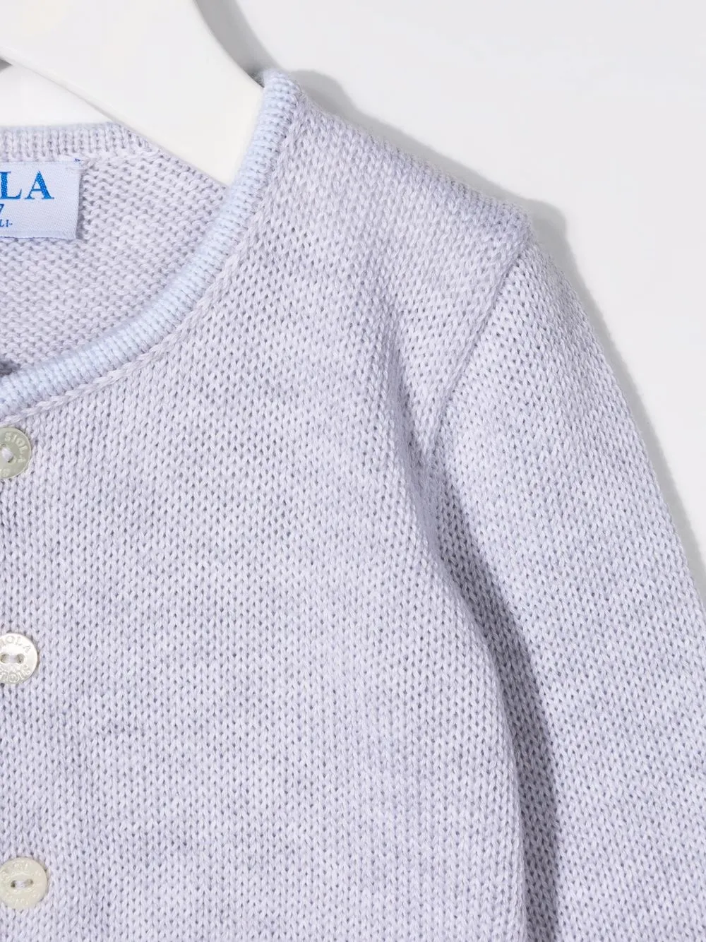 Вязаные края в рубчик, круглый вырез, длинные рукава, прямой подол и застежка на пуговицах спереди.
