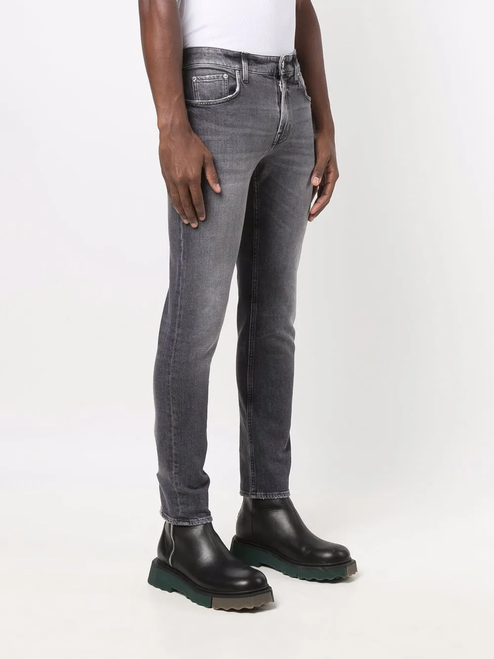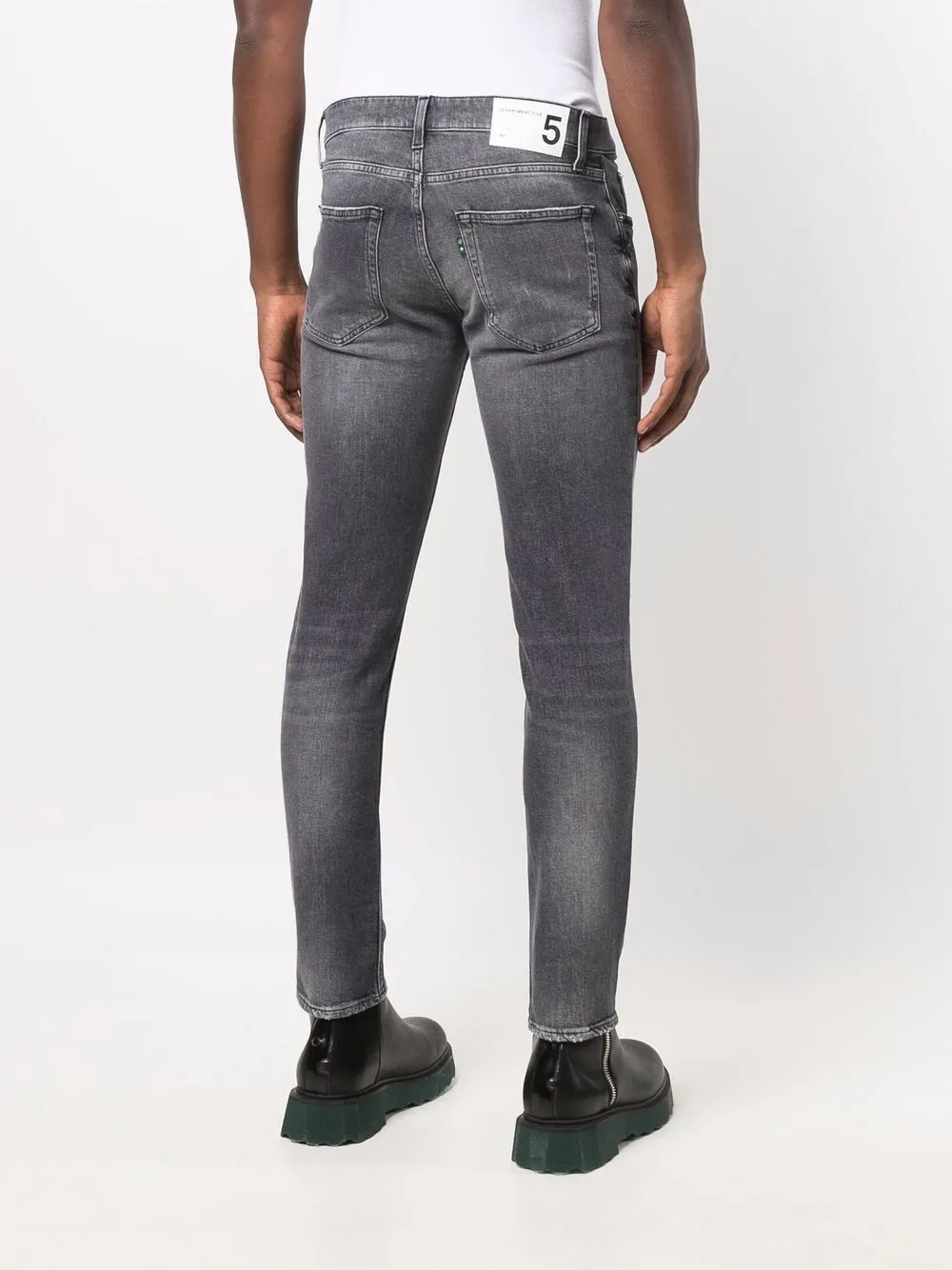 Ширинка на пуговицах, петли для ремня, классическая пятикарманная модель, декоративные складки, эффект потертости, нашивка с логотипом сзади и облегающий крой. Цвет: серый.