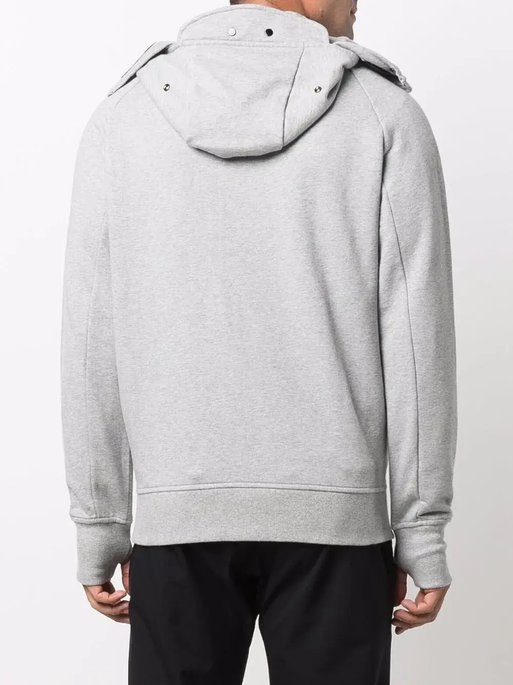 Классический капюшон, застежка на молнии спереди, длинные рукава и два кармана на молнии по бокам. Цвет: серый.