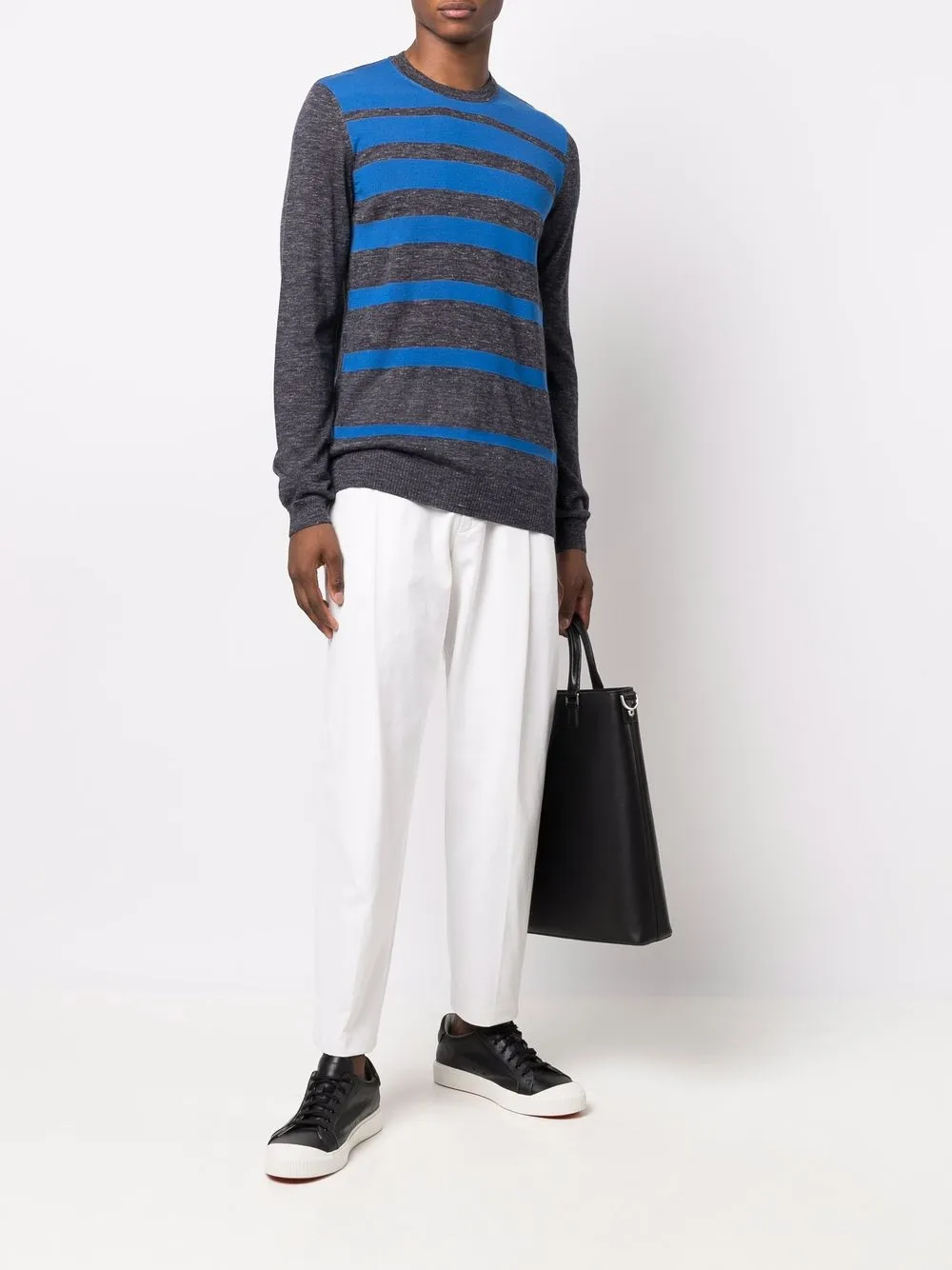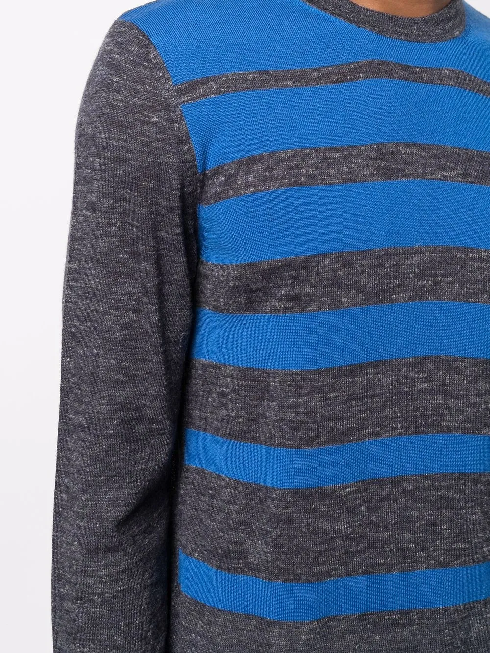 Сочетание двух оттенков, узор в горизонтальную полоску, трикотажный материал, длинные рукава и круглый вырез. Цвет: серый.